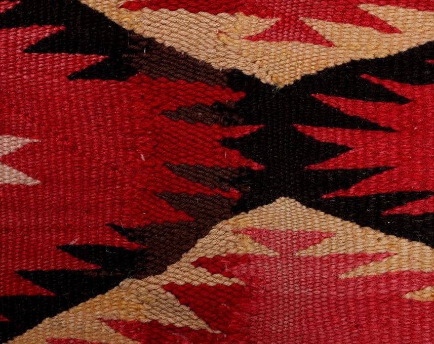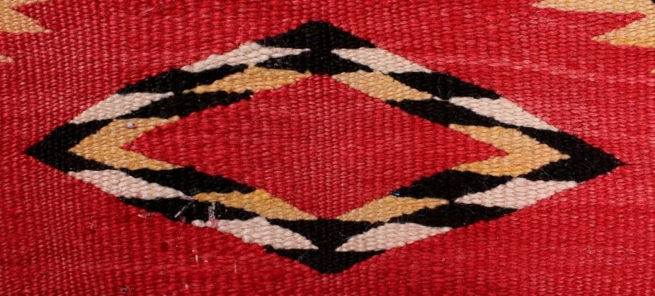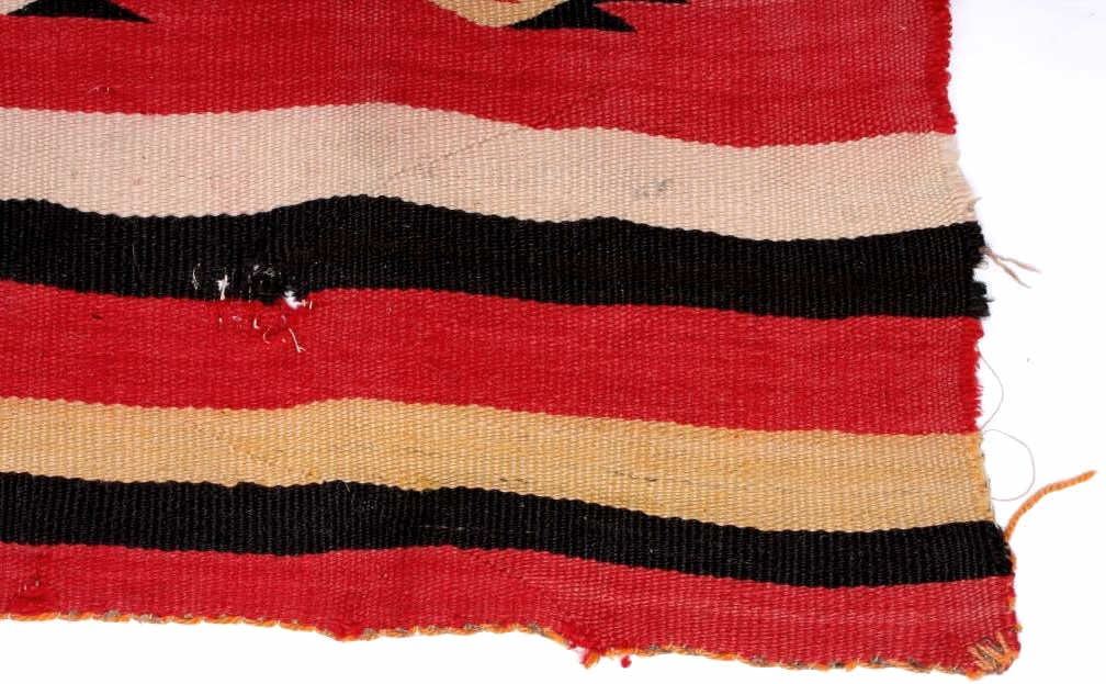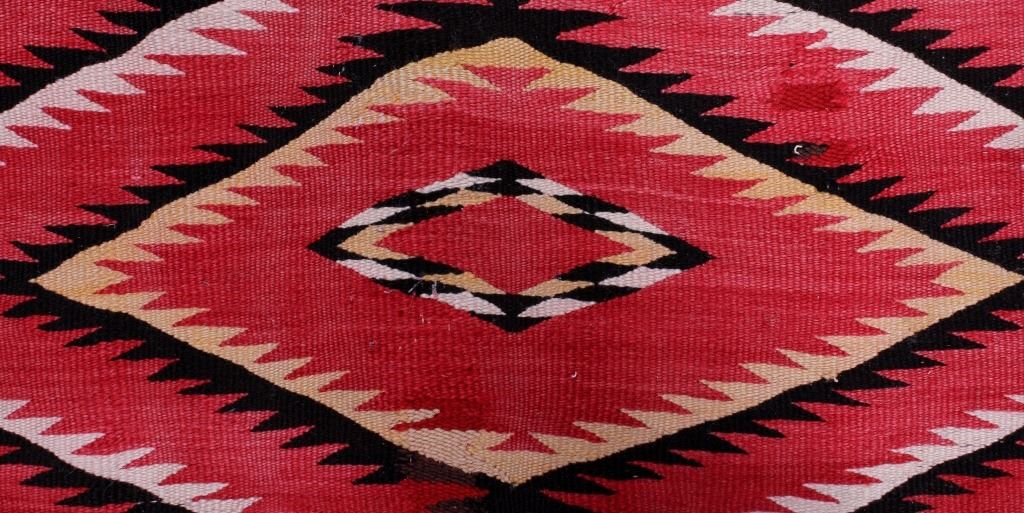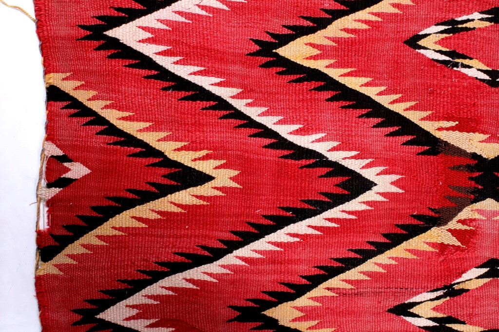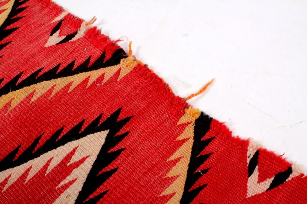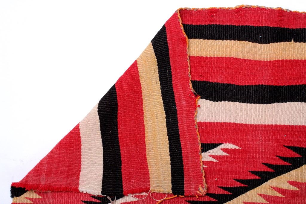 For your consideration is this circa 1900 Transitional Navajo Eye Dazzler wool rug. The rug features a primarily red field having four central Chinle Stars/ diamond shapes that repeat in a growing, outward pattern. The other colors used in the pattern are black, goldenrod, and tan. The rug is bordered on both ends with seven bands: 3 red, two black, one goldenrod, and one tan. The rug is in good condition for its 100+ year old age but does have some color change and loose warps from time and wear. The rug measures 77" x 45".
