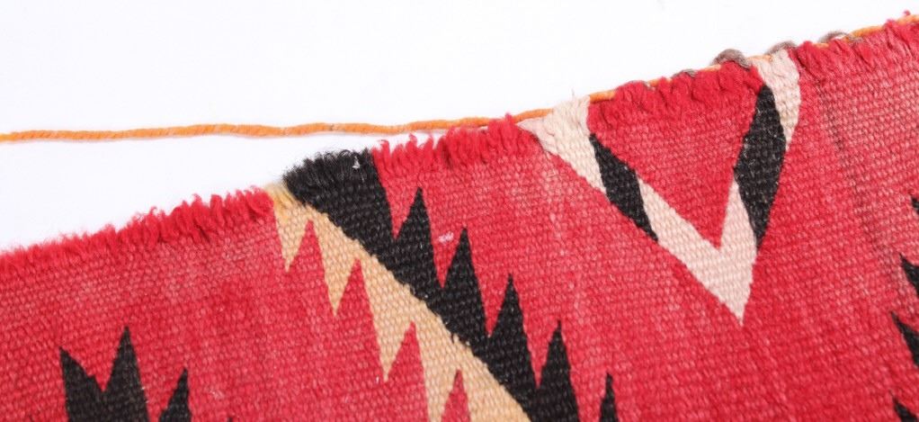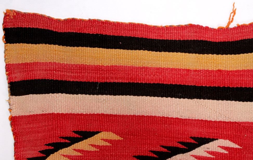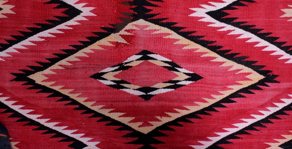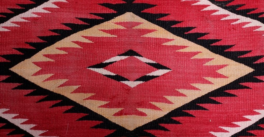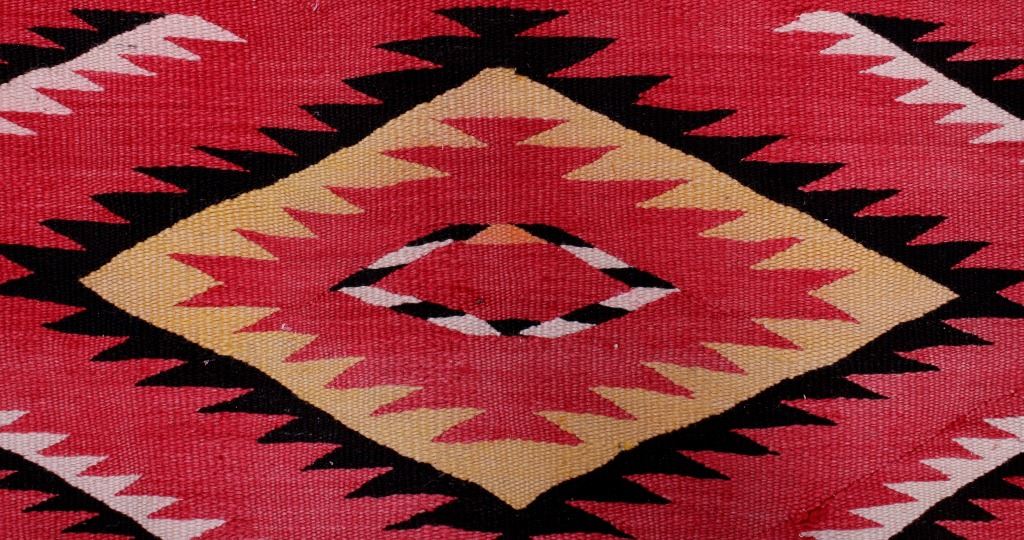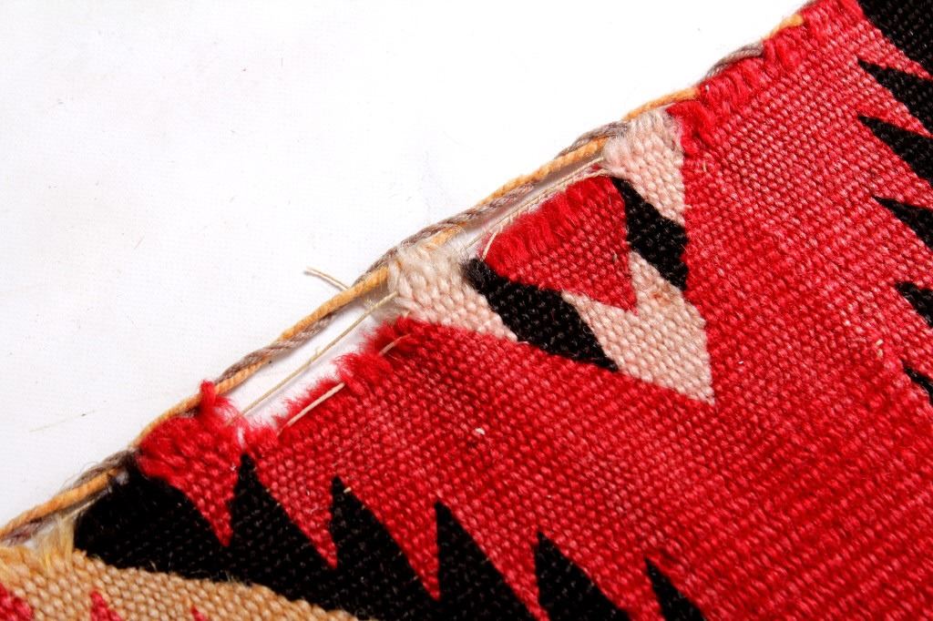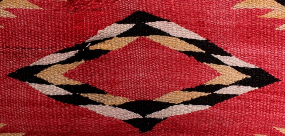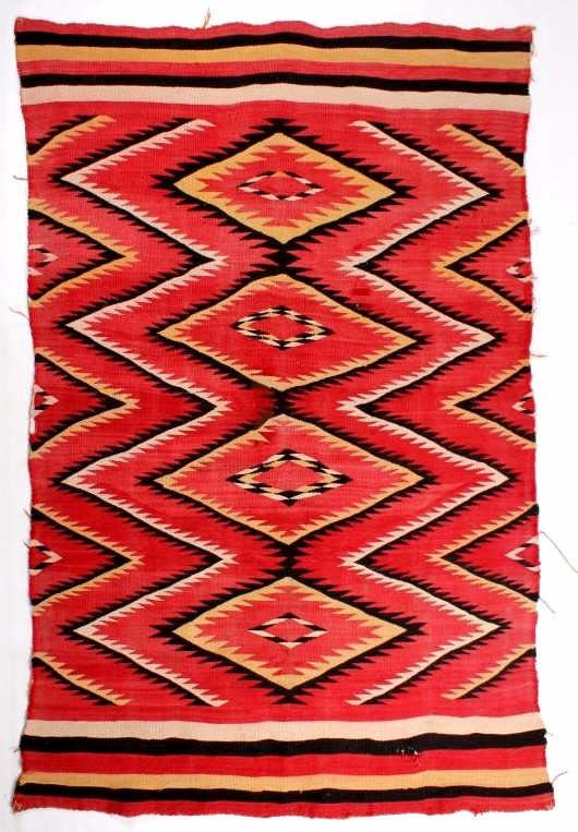 For your consideration is this circa 1900 Transitional Navajo Eye Dazzler wool rug. The rug features a primarily red field having four central Chinle Stars/ diamond shapes that repeat in a growing, outward pattern. The other colors used in the pattern are black, goldenrod, and tan. The rug is bordered on both ends with seven bands: 3 red, two black, one goldenrod, and one tan. The rug is in good condition for its 100+ year old age but does have some color change and loose warps from time and wear. The rug measures 77" x 45".