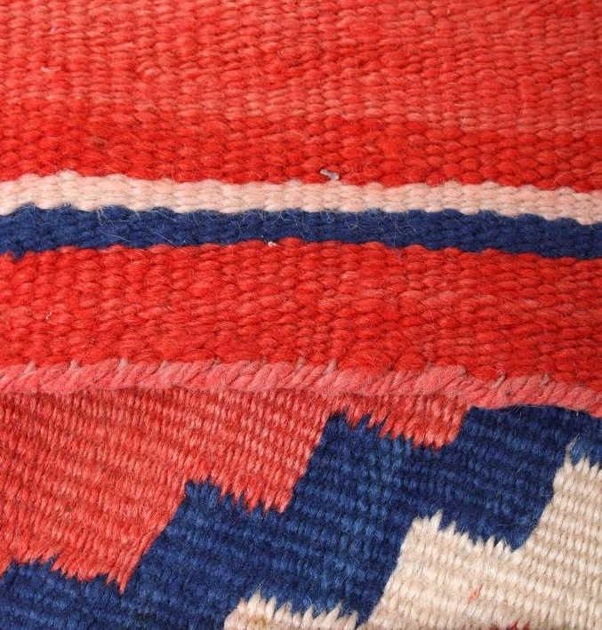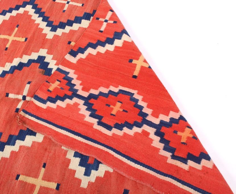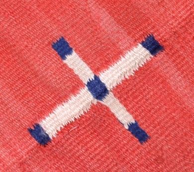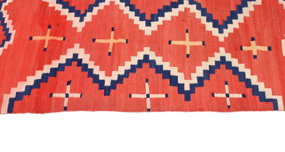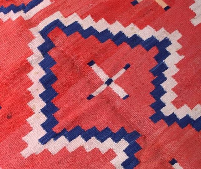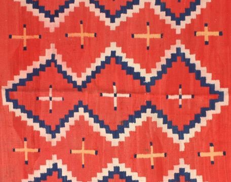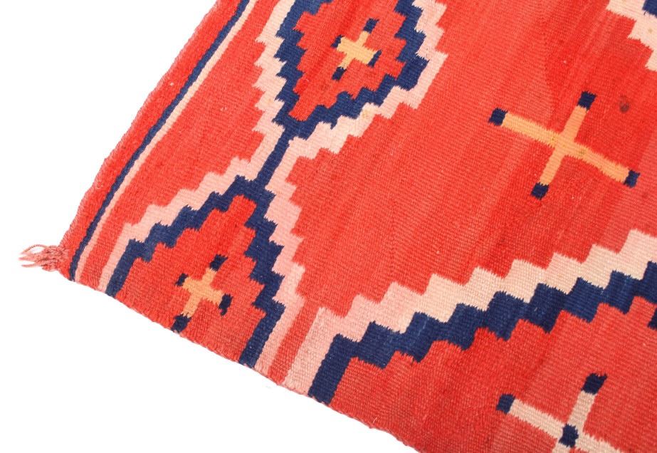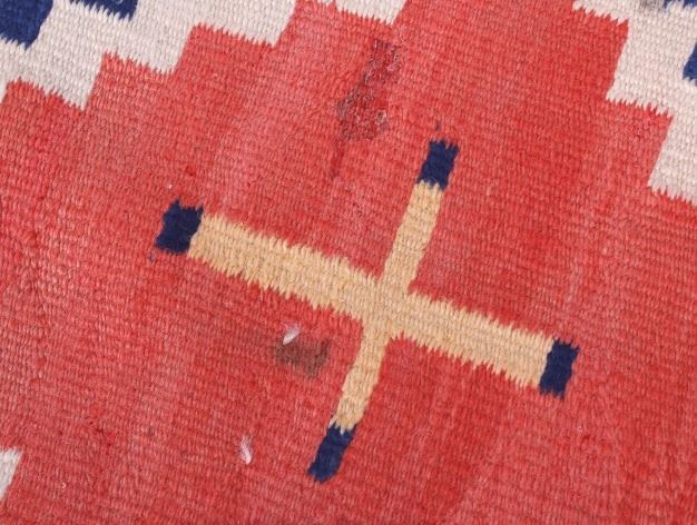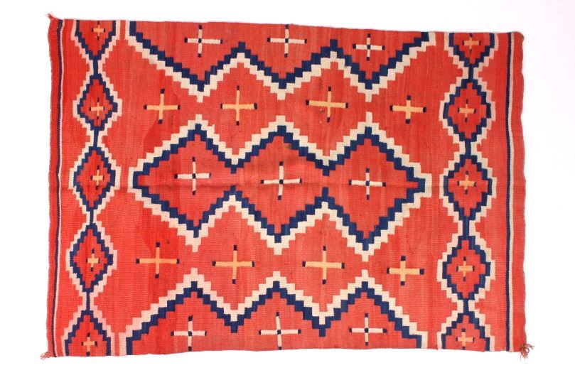 Offered for bidding in this lot is a Navajo Native American Indian Ganado pattern wool rug. the Ganado style of weaving was established by Lorenzo Hubbell in late 1800. The motif generally consists of one or more stepped diamonds or stepped and embellished triangles. The rug shows a predominantly soft salmon red background, showing alternating rows of polychrome crosses, and dominated by geometric diamonds. The rug originates from the early to mid 1900's, between 1910-1930. Overall, the rug shows good condition, with some very slight insect damage. The rug measures 52 1/2" x 77 1/2".