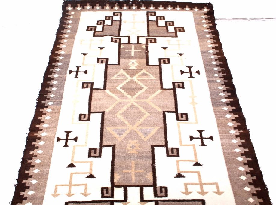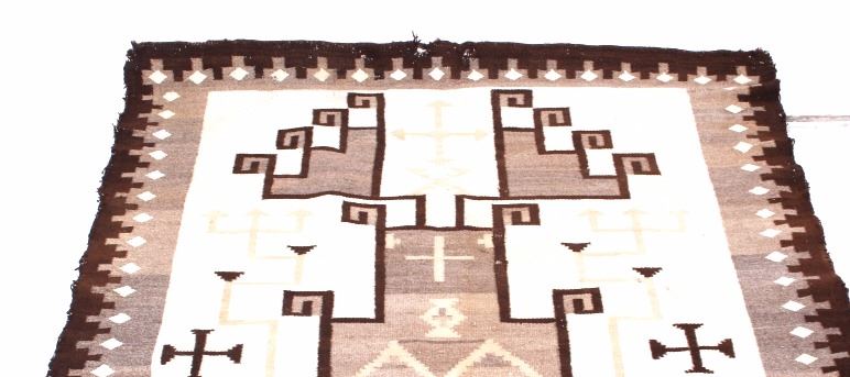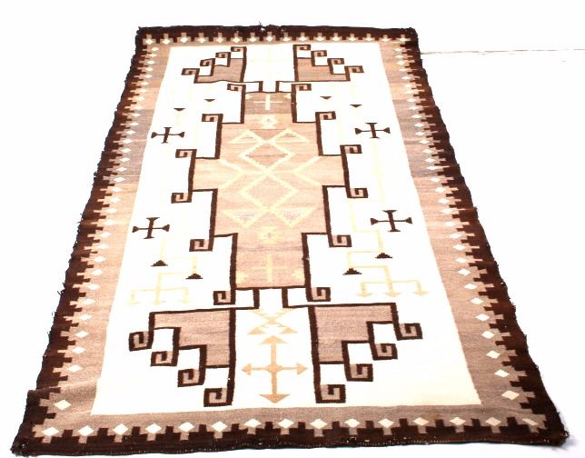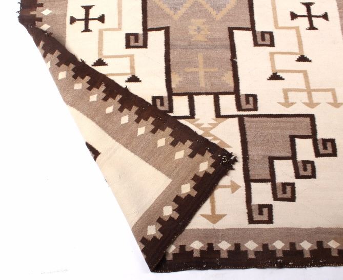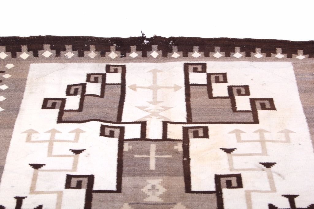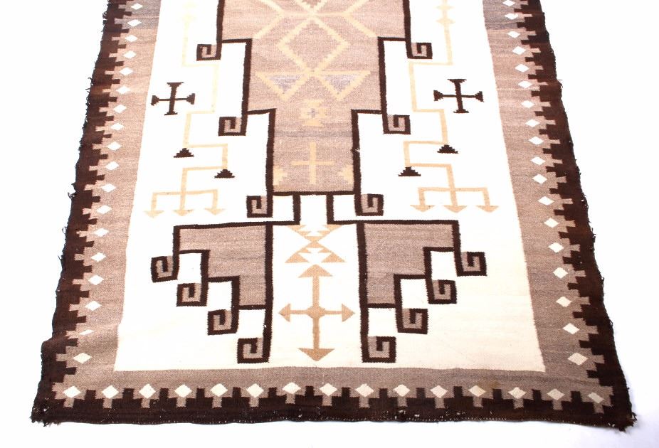 This lot features an early Navajo rug form the Two Gary Hills region. This regional style was started in 1914 by George Bloomfield and Ed Davis at the Toadlena and Two Grey Hills Trading Post. These Navajo rugs are characterized by natural browns, tan, gray, ivory, white, and black. The patterns usually have a central diamond motif and intricate patterns. The Two Grey Hills weavings are noted for their high quality. The trading post is located in northwest New Mexico, south of Shiprock and northeast of the Crystal area. The rug has a stunning pattern and tight weave. Does show some signs of wear. The piece is in good condition for its age. Measures: 85" L x 49" W