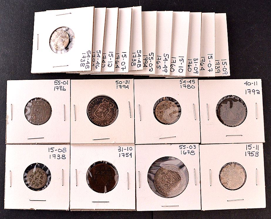 Netherlands, Gelderland, Duit, 1794; 2 Stuivers, 1792; Groningen and Ommeland, Stuiver, 1765; Holland, Duit, 1742; Stuiver, 1738-64, KM#91, (5); 2 Stuivers, 1753; Utrecht, Duit, 1792; 2 Stuivers, 1780; 1/4 Gulden, 1794; West Friesland, Stuiver, 1738, (2); 2 Stuivers, 1786; 6 Stuivers, 1678; Zeeland, Duit, 1754; Stuiver, 1760; Grades range from Good to VF, most VG. Total of 19 coins
