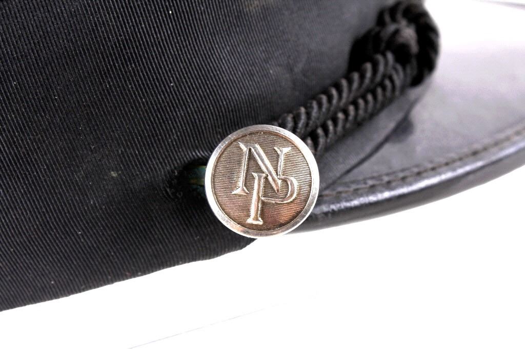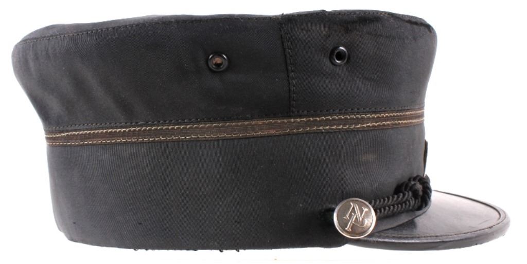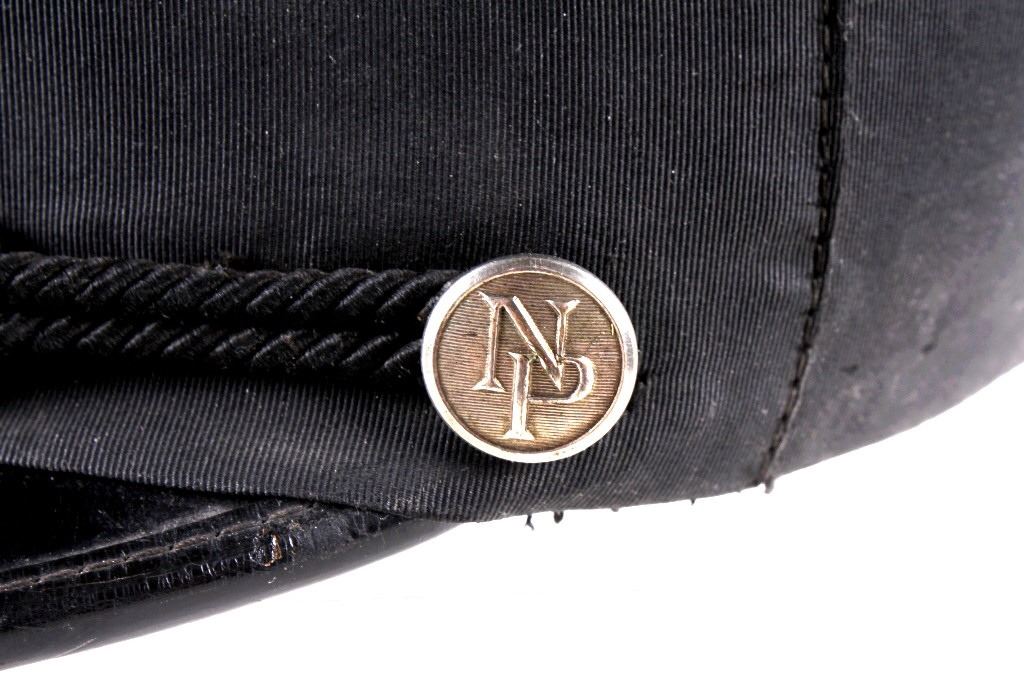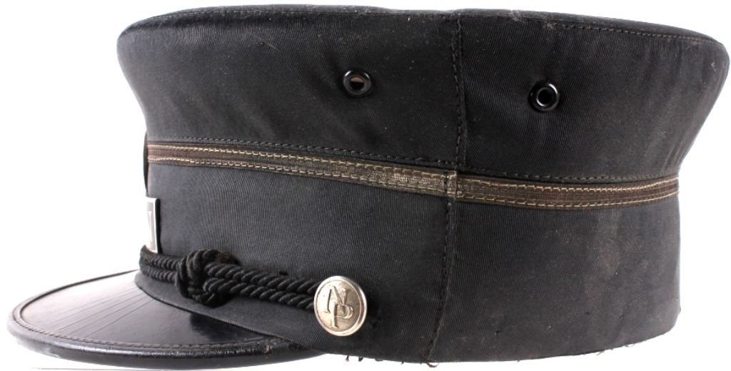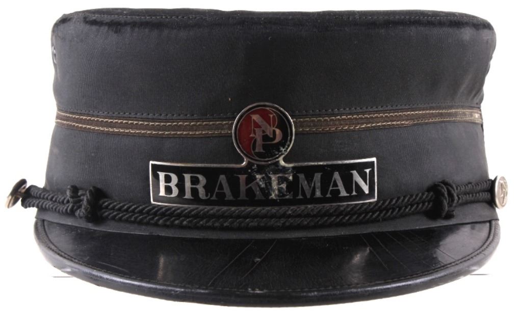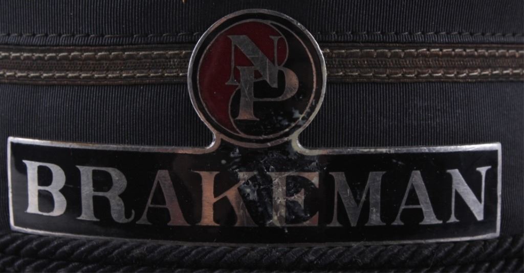 The lot features an early Northern Pacific Railroad Brakeman Cap collected in Northwest Montana. Northern Pacific Railroad, also referred to as Northern Pacific Railway or NPR, NP. The cap shows the original metal NP Brakeman badge along the front with ying and yang black and red NP logo above all caps BRAKEMAN rectangular plate. The hat also shows two nickel silver like NP original buttons on either side. The hat was made by The Pettibone company in Cincinnati as is marked on the inside of the leather band. The hat also shows a tag that reads the size of 6 7/8. The hat was likely from a Montana Depot and is in well preserved condition. The cap's circumference is 21"