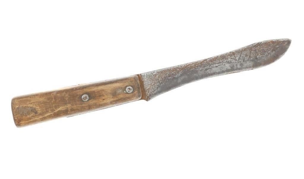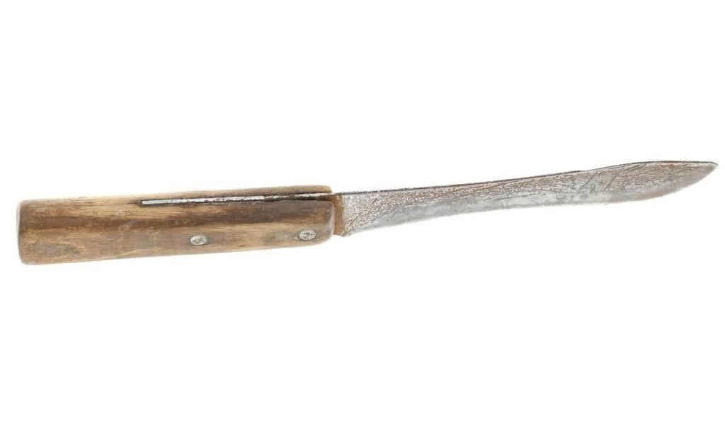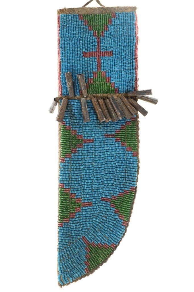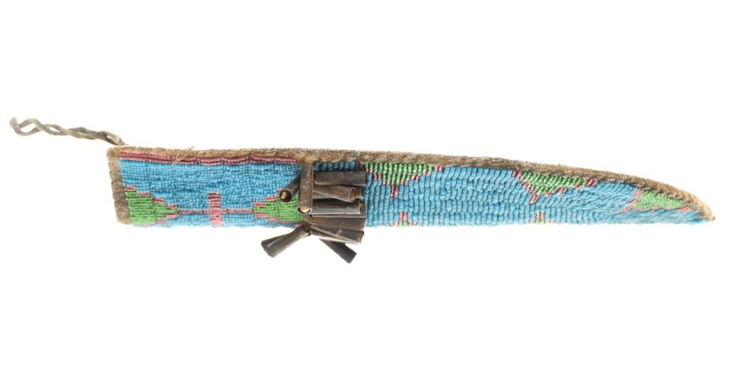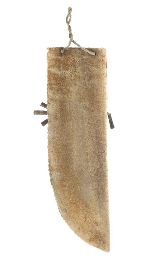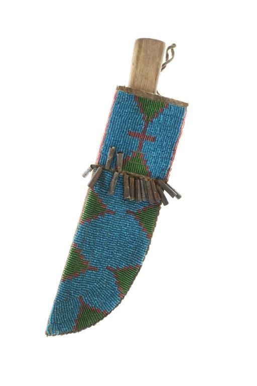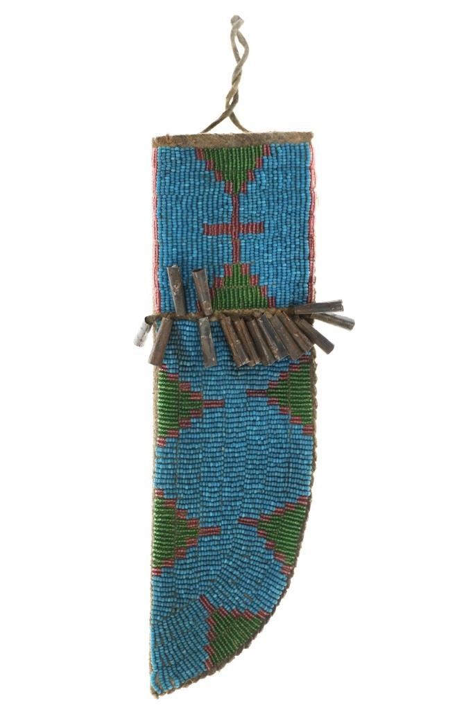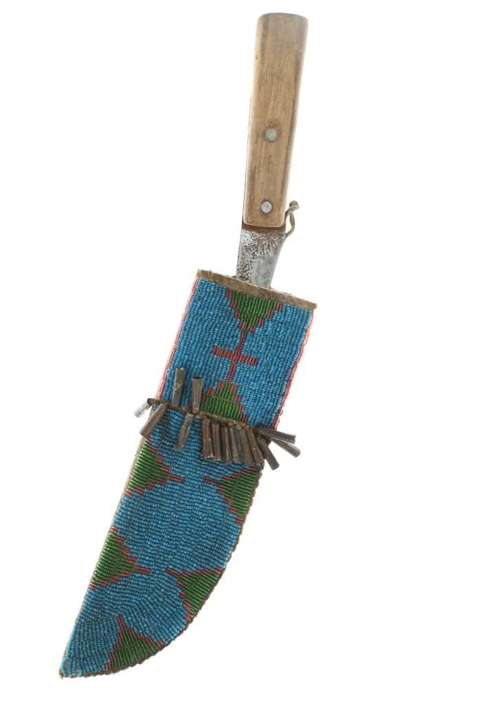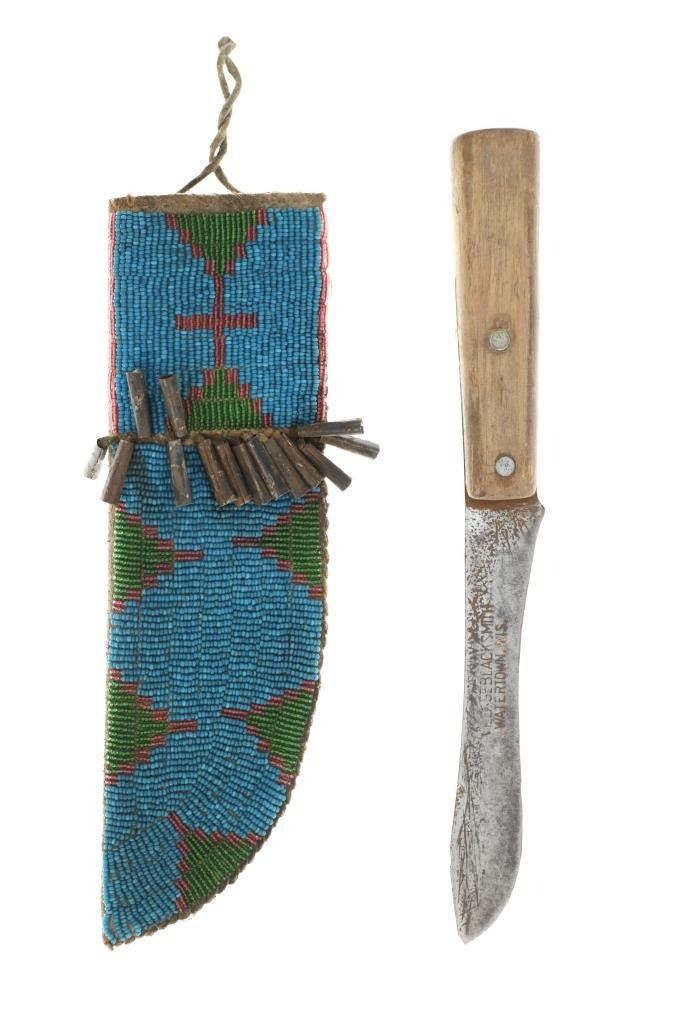 This is a fantastic early beaded buffalo hide covered parfleche lined beaded sheath and blacksmith trade knife from the Northern Plains. The sheath is comprised of brain tanned buffalo / bison hide with a parfleche rawhide lining being sinew sewn and has elaborate beaded geometric design in typical Northern Plains pattern including a greasy blue background and pattern in semi-transparent green, semi-transparent lilac. At the middle is a row of Indian tanned hide fringes with rolled tin jingle cones, a common Plains and Northern Plains feature. The bag is sinew sewn and the beadwork is sinew sewn, both early beadwork attributes. The sheath is paired with a Village Blacksmith Watertown, Wisconsin marked trade knife with one piece wood grip. The knife has a typical skinner, sometimes referred to as “scalping”, body of the knife which refers to the belly of the knife being curved in. The Village Blacksmith moved to Watertown in circa 1906 with this being an early example. Both have a nice wear with the blade of the knife have various cuts and some pitting. The sheath shows some slight bead loss to the edge, but overall little bead loss and well kept. Provenance: Tom Hardy Indianapolis collection. Sheath is 12”L by 3”W. Knife is 10.5”L.