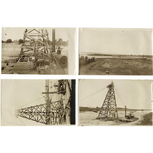 <B>Early Oil Derrick Photo Group.</B></I> Series of eight sepia photographic prints, 5" x 7.5", showing an oil drilling operation at the turn of the last century. There are three close-up images of a primitive derrick and the steam engine which powered it; three panoramic views of a flood plain in which a derrick is visible; and, two panoramic shots of the same flood plain in which no oil rigs are present. It is likely that these shots were taken in South Texas. There might be enough visual evidence here for the serious oil historian to identify the location. A rare and unusual set of historic photographs.<BR><BR><b>Shipping:</b> Miscellaneous Collectibles, Smal (<a target="_blank" href="http://www.heritageauctions.com/common/shipping.php">view shipping information</a>) <BR><BR><B>Important notice:<
