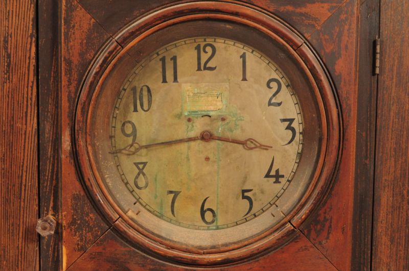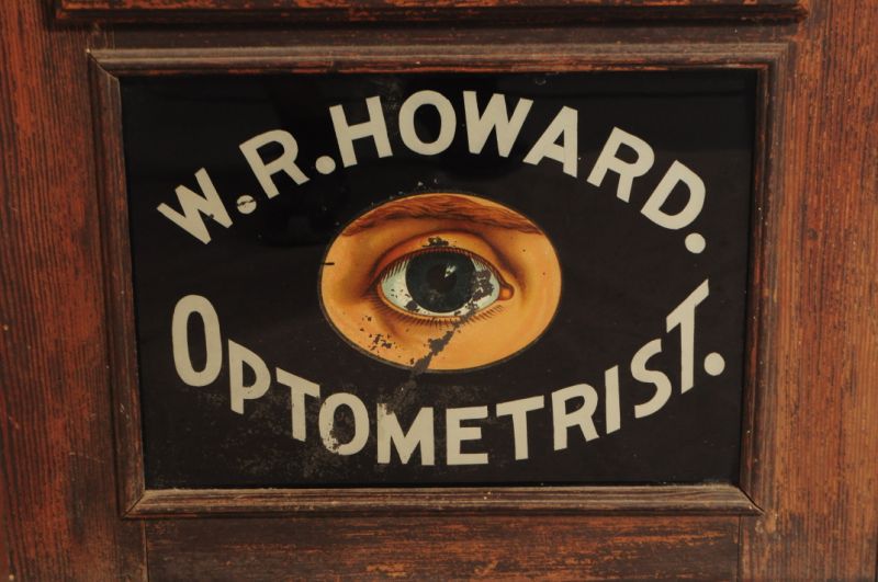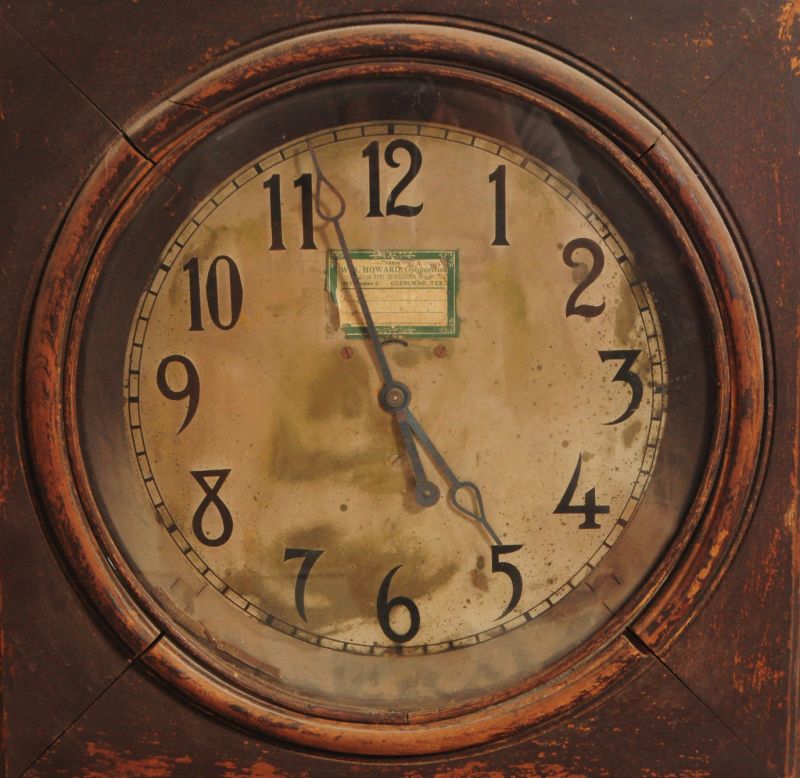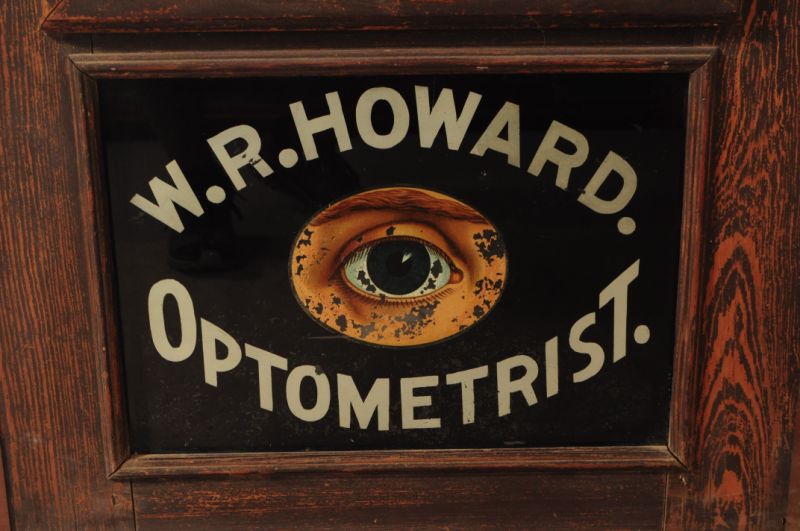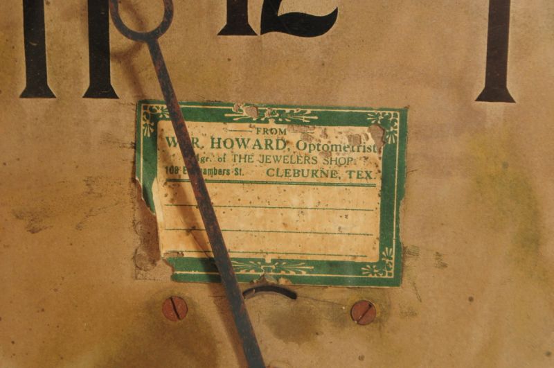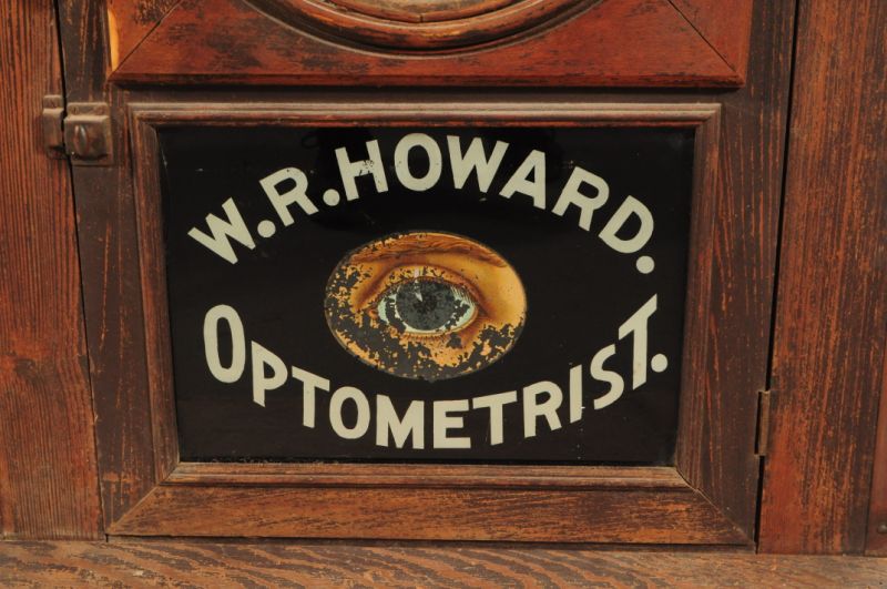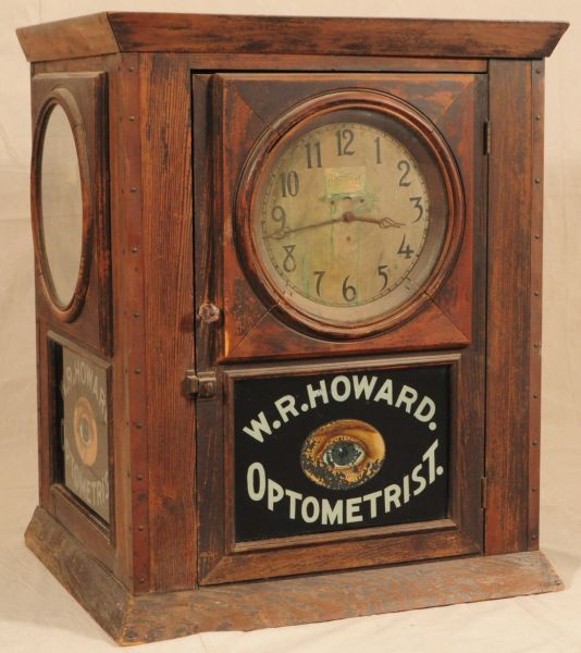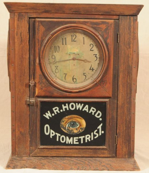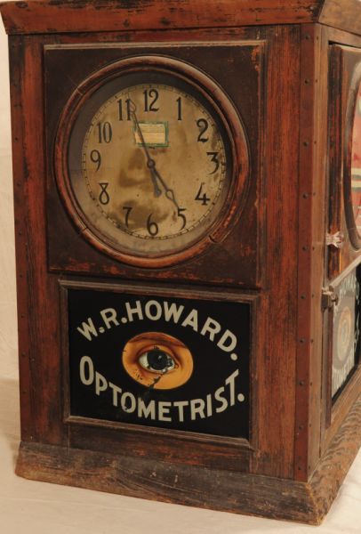 Early Optometrist Advertising Clock. Reverse painted Glass Advertsing W.R. Howard Optometrist. Clock feature 3 faces, one of which retains a label clearly marked Cleburne Texas.