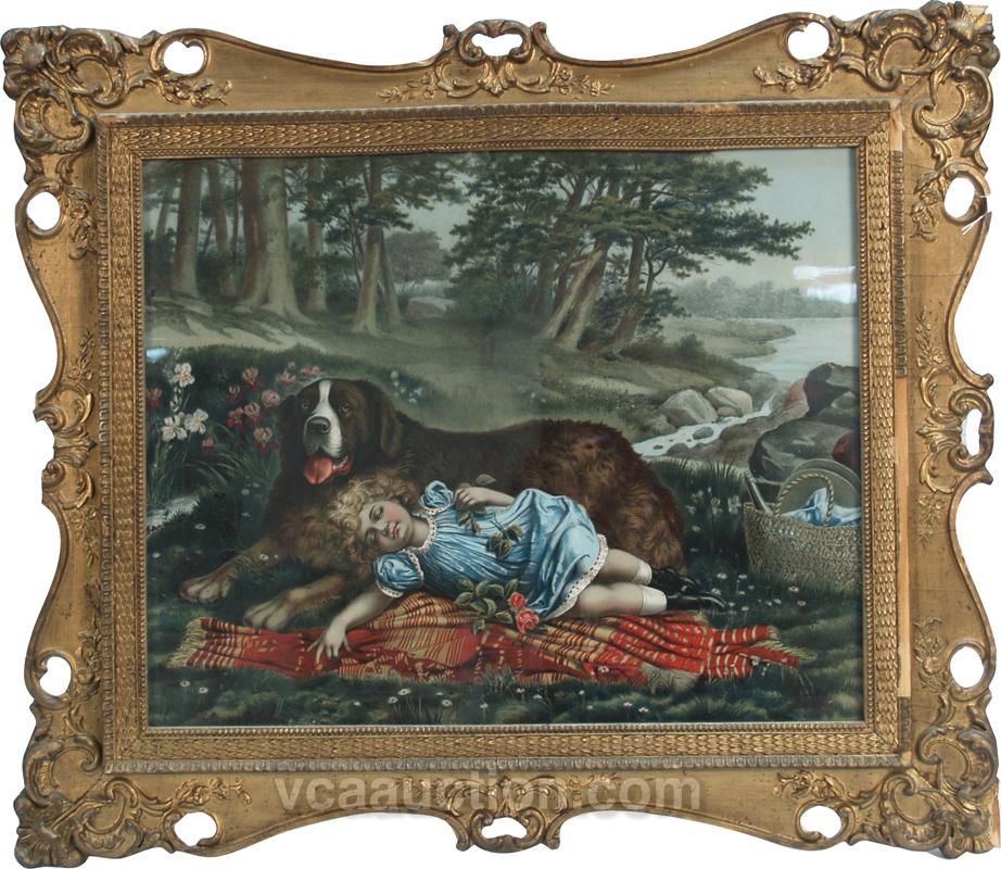 Early Original Print Titled "Fast Asleep" depicts little girl w/ St. Bernard dog outside sleeping in the woods, artist unkown very colorful print in ornate frame - 27" x 23"