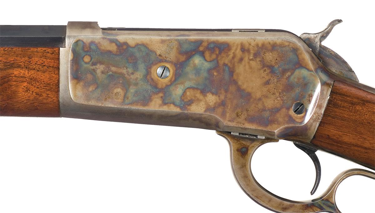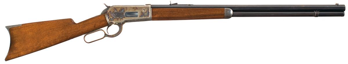 Condition: Excellent. The rifle retains nearly 95% of the original blue and casehardened finish. The barrel has some minor finish loss on the edges near the muzzle and the blue finish on the magazine shows very light handling wear. The blue finish on the bolt, loading gate and trigger is 99%. The case colors on the forearm cap are muted but visible. The sides of the receiver, upper and lower tang, hammer and sides of the loading lever have vivid case colors. The case colors on the top and bottom surfaces of the receiver and loading lever have 50%, with the balance faded to a silver-gray patina. The buttplate has a silver patina with some very minor age spotting. The barrel and lower tang markings are crisp. The bore is bright. The stock and forearm are in excellent condition; nearly all of the original varnish finish is present and handling and storage wear is minimal. This is an outstanding example of a Winchester Model 1886 Sporting Rifle with very desirable casehardened receiver.