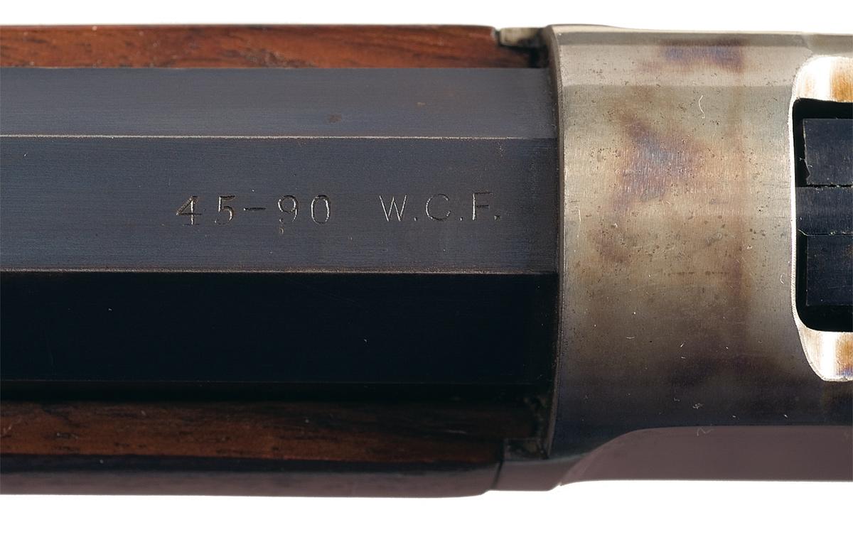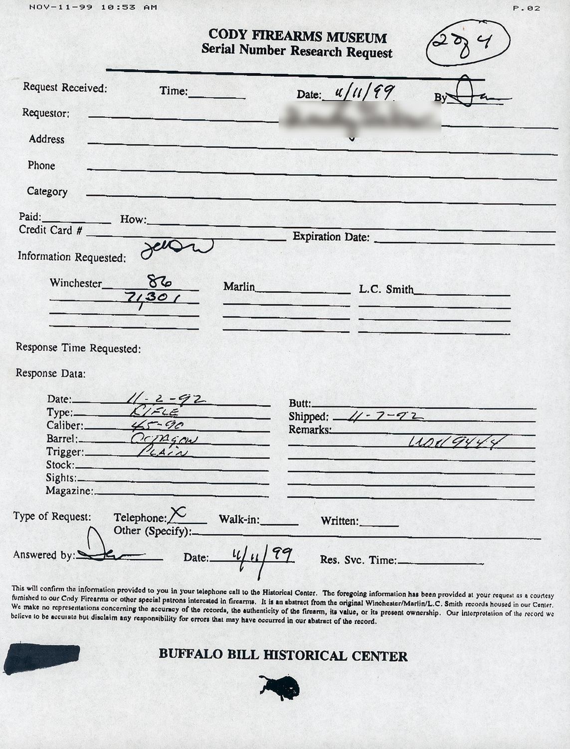 Winchester Model 1886 Sporting Rifle with Cody Firearms Museum Serial Number Research Request. The request states that this rifle was shipped from Winchester on November 2, 1892, and describes it as a "Rifle, Caliber 45-90, Octagon Barrel" with "Plain Trigger". The rifle has a full length magazine and the barrel is fitted with a nickel-silver, blade front sight and sporting style rear sight. The barrel, magazine, bolt, loading gate and trigger have a blue finish. The forearm cap, receiver, hammer, loading lever and recarved crescent buttplate are color casehardened. The stock and forearm are straight grain walnut with a varnish finish. The top of the barrel is roll-stamped with the legend: "- MANUFACTURED BY THE - / - WINCHESTER REPEATING ARMS CO.NEW HAVEN.CONN.U.S.A. - " in two unequal lines. The caliber, "45-90 W.C.F.", is roll-stamped on the top of the barrel behind the rear sight. "- MODEL 1886 -" is roll-stamped on the upper receiver tang. The 1884 and 1885 patent dates and the serial number "71301" are stamped on the lower receiver tang.