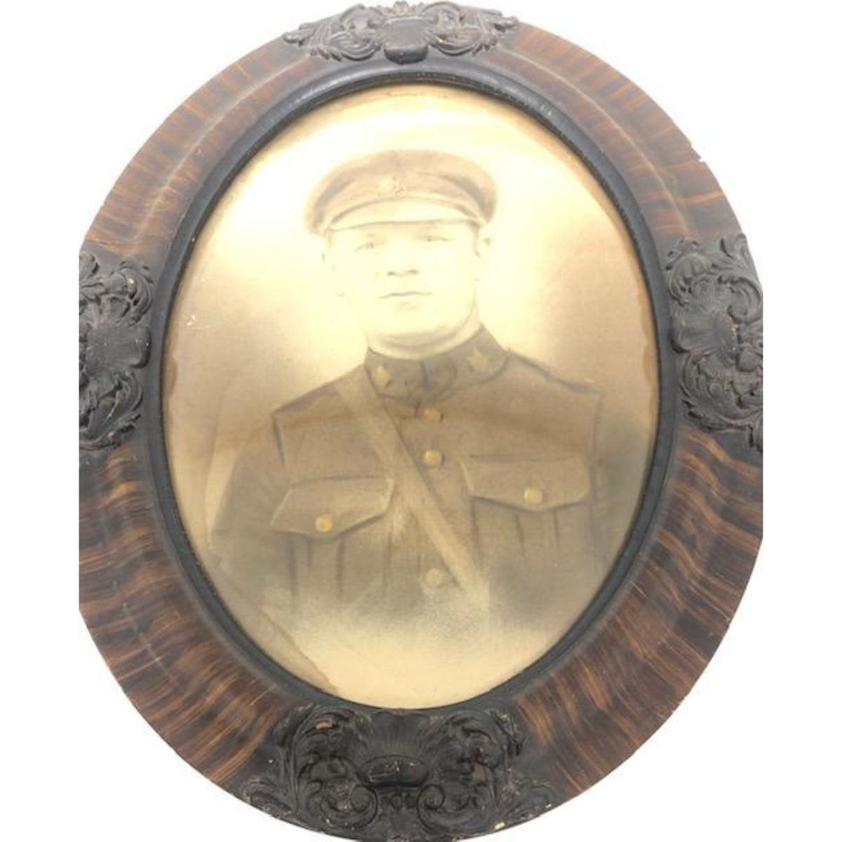 Early Oval Tiger Grain Framed Portrait Of A Soldier. Picture in great condition, frame has some chips due to age. 25" x 19", view photos for further inspection.Â