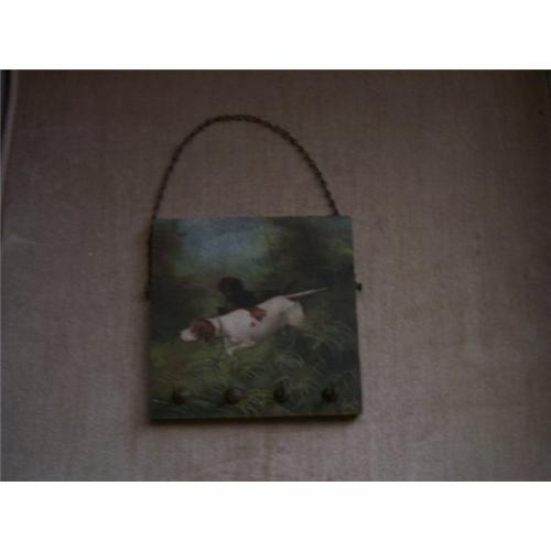 This is just a beautiful piece.Almost was going to keep it but have no room left.Painting on an old wood board of two hunting dogs.There are four hooks at the bottom that could be used to hang keys,whatever on.Nice chain.On the back of the painting there is indented writing on the board.Looks like it was part of an old wooden box at some time.Has one very light scratch? on the right side.Blends in well though so you really do not notice it.It measures 6 1/4" across by 6" tall.