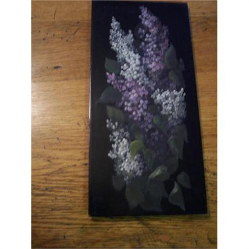 This is one of a pair of early painted florals on a wooden board.This one has lilacs on it.Has like a black laquer background.These came from an estate in Westchester Co. N.Y.and was told they date to the late 1800s.It measures 7 1/8x15.The next one is of roses and they look wonderful together.