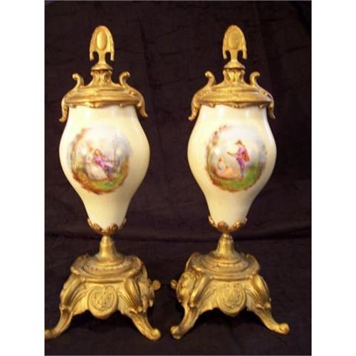 Beautiful pair of early portrait urns on a creamy beige ground. The paintings depict Victorian scenes and costumes. The elaborate metalwork looks to be brass or bronze. The urns measure 12" tall and are 6" wide at the base. I thought this pair was in excellent condition, but was shocked to find a repair when I was taking the pictures. I can't believe I didn't see this. One leg was broken at some point and has been professionally repaired. you really can't see it. The only reason I finally noticed is because the foot is different than the others. When you turn the urn over, you will see the repair clearly. (See the pictures). Other than this, they are in very nice condition. These were very popular Victorian decorating pieces. Very pretty.
