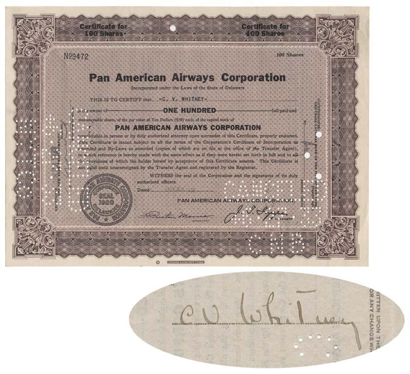 1933, Delaware. Stock certificate for 100 shares of Pan American Airways Corp. Purple/Black. Issued to and signed on verso by CORNELIUS VANDERBILT WHITNEY Financier, co-founder of Aviation Corporation of the Amercas and Pan American Airways. The son on Harry Payne Whitney and the grandson of Cornelius Vanderbilt, Whitney was one of the wealthiest men in America and provided critical financial support for Juan Trippe's plans for the airline business during the late 1920's and early 1930's. Facsimilie signature of Juan Trippe. Punch cancellations not affecting signature.