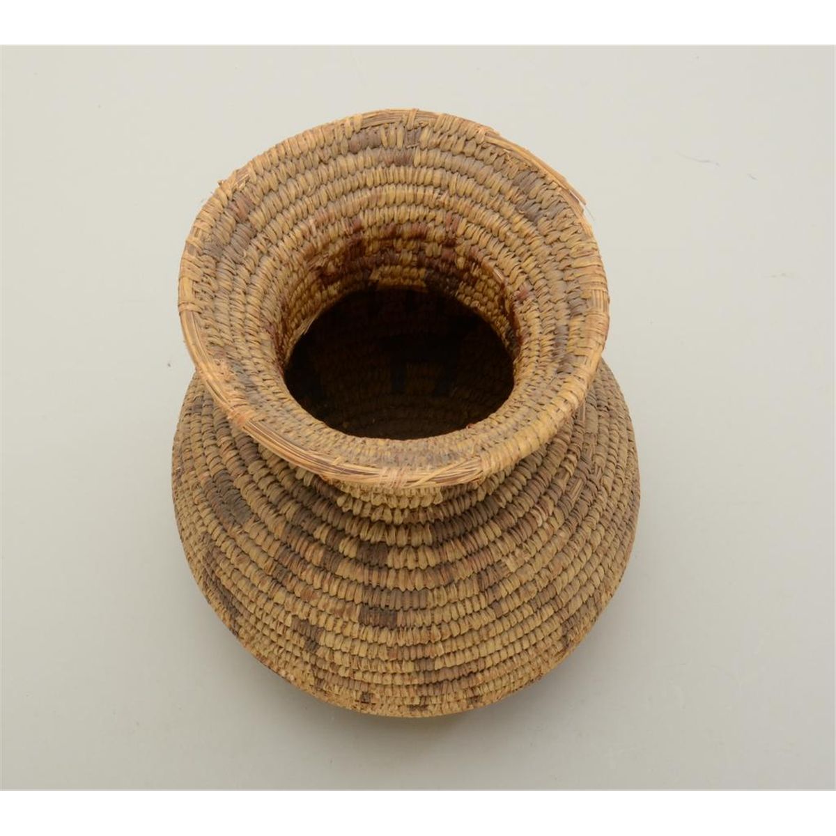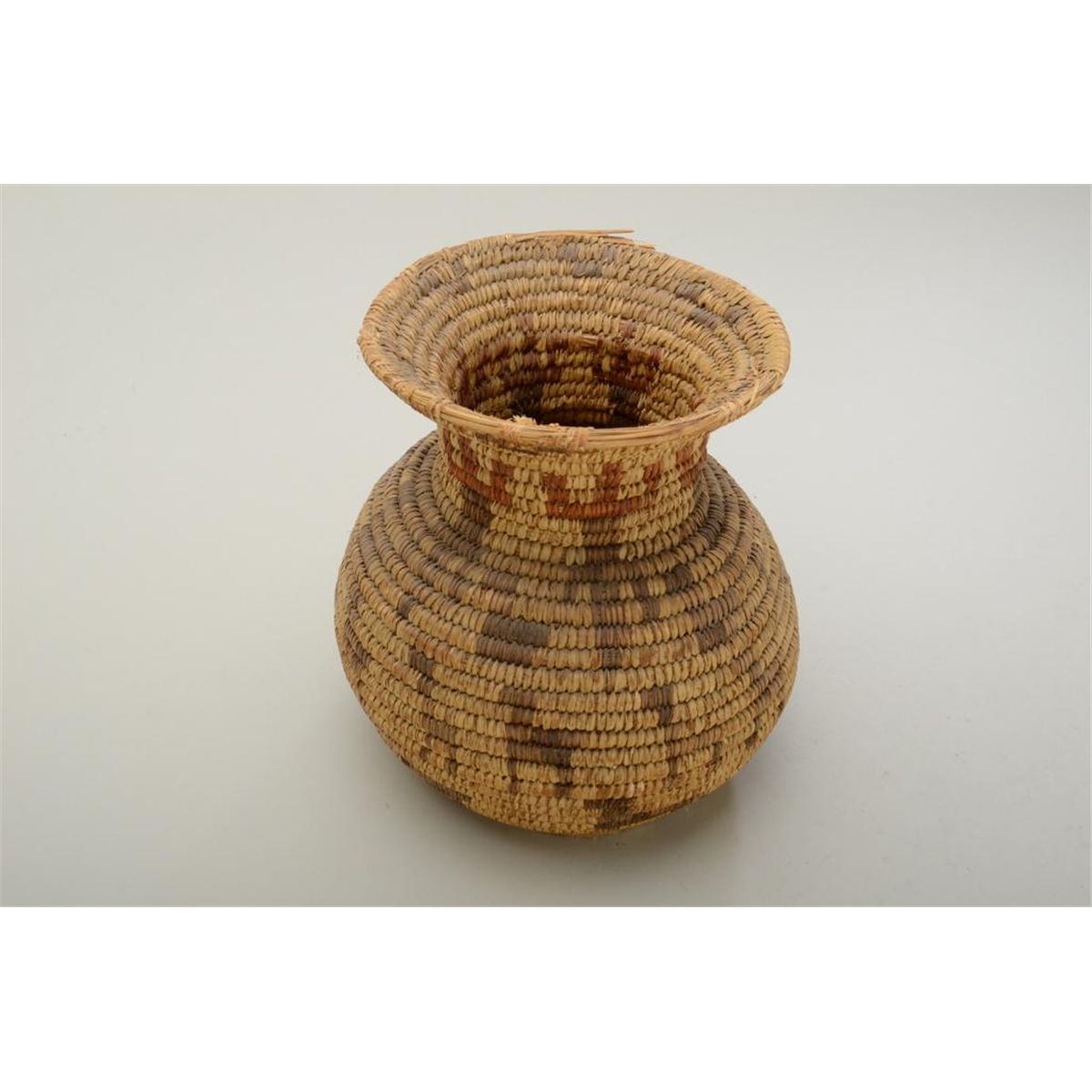 Early Papago Indian woven basket, approx. 9” in height, approx. 8” in diameter at widest point, stick figure and animal repeating pattern in overall very good condition with some loss and damage to rim. Est.:$125-$250.