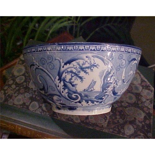 This is a fine little bowl, thinly potted and in superb condition. Blue transfer designs of English countryside scenes inside and out. I do not know the maker or the pattern, and it is not marked. Crisp transfer and medium blue in color. 5" in diameter and about 2.5" high. Dates to about 1820 to 1830.