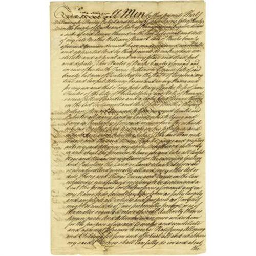 <B>Early Pennsylvania Power of Attorney Manuscript Document Signed,</B></I> “<I>Hannah Harris,</B></I>” two pages with docketing, 9” x 15”, Philadelphia, March 15, 1784. A widow, Hannah Harris, gives Bucks County attorney John Hunter power of attorney and, in the event of his death, names James Wilkinson of Kentucky “<I>in the State of Virginia</B></I>” to the position. Signed and witnessed by John Morton, John Dunlap and William Webb. Large split along top, chipping, stains and general browning. Good condition.<BR><BR><b>Shipping:</b> Flat Material, Small (<a target="_blank" href="http://www.heritageauctions.com/common/shipping.php">view shipping information</a>)