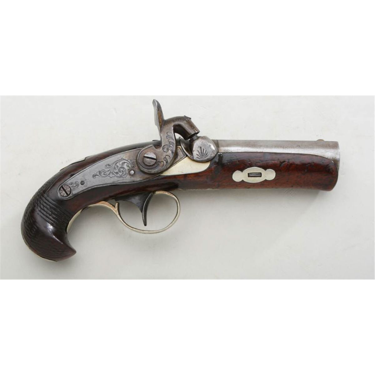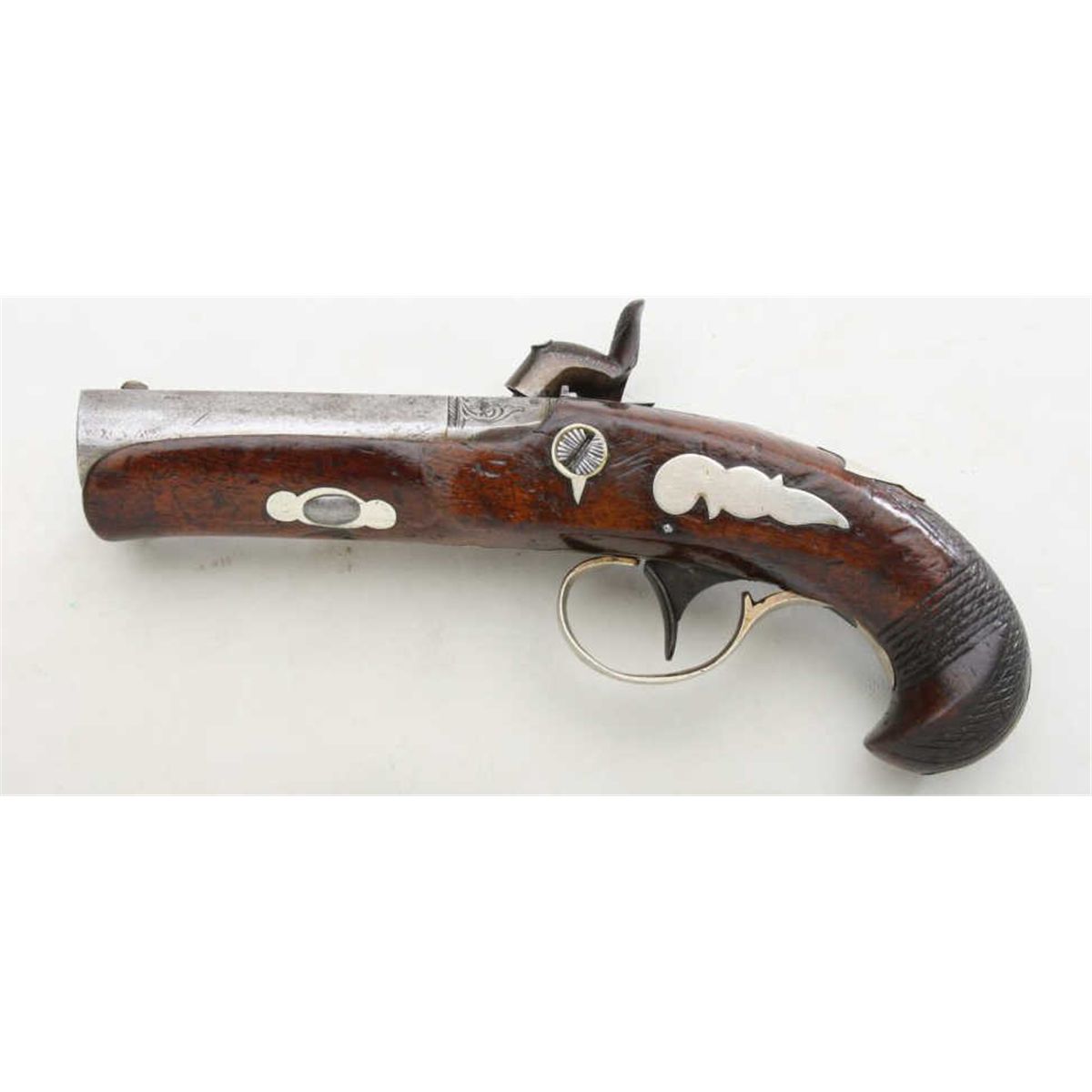 Early Philadelphia derringer attributed to John Branch, .44 caliber, 6-1/2” overall with 2-1/2” barrel, full stocked, engraved German Silver mounts, with characteristic straight-profile to forend and uniqueescutcheons and inlays. Condition is good to very good overall with a pleasing patina, traces of case hardening. Stock good to very good with some wear at the edges to the checkering. The barrel shows six-grooverifling, generally good to very good overall. Est: $1,250 - $2,500