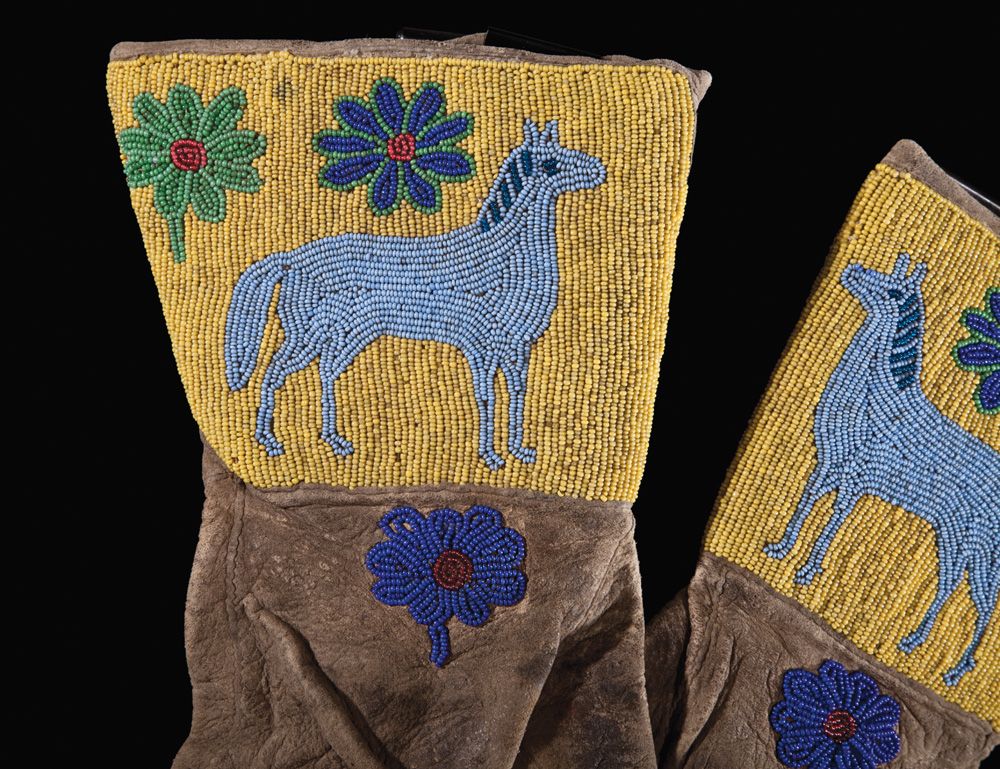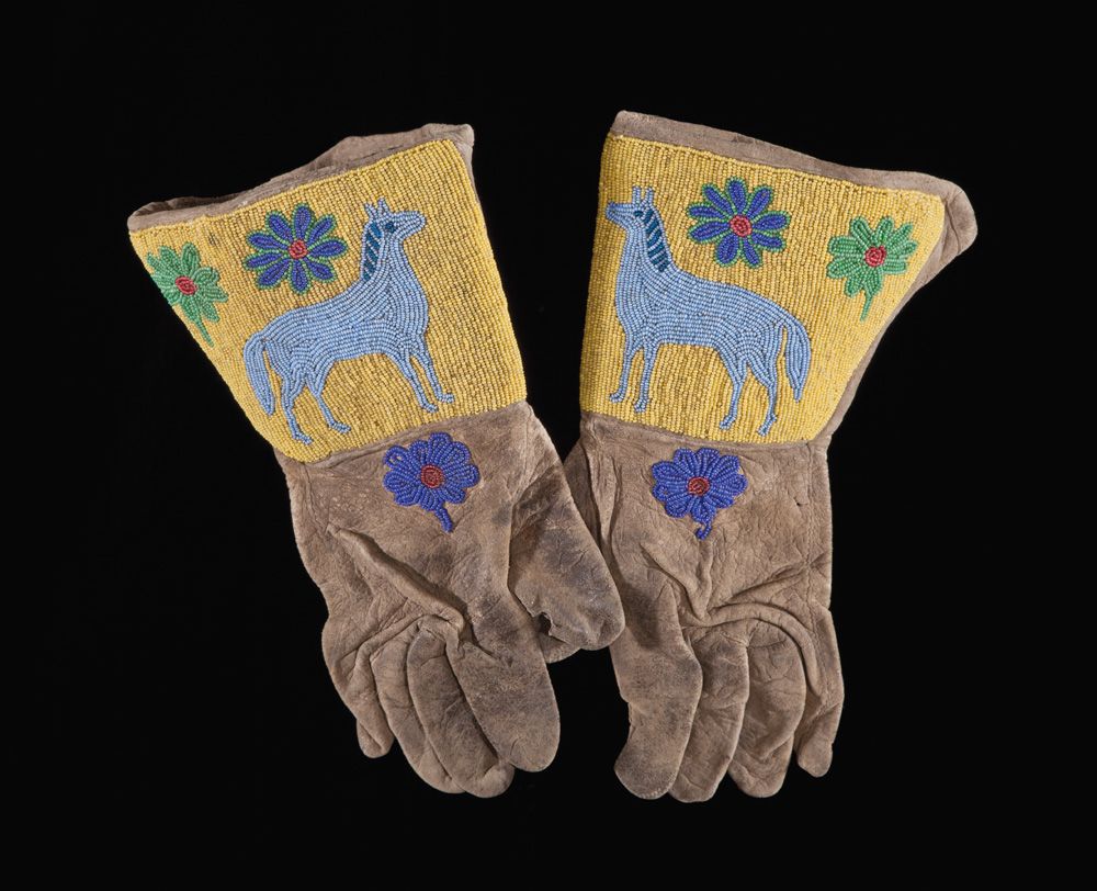 Blue standing horses on yellow field with multicolored flowers. Dark blue flowers on hand. Good condition with some wear to the fingers. Panels are 6” x 4 1/2” and the gauntlets are 11 1/2” overall.
