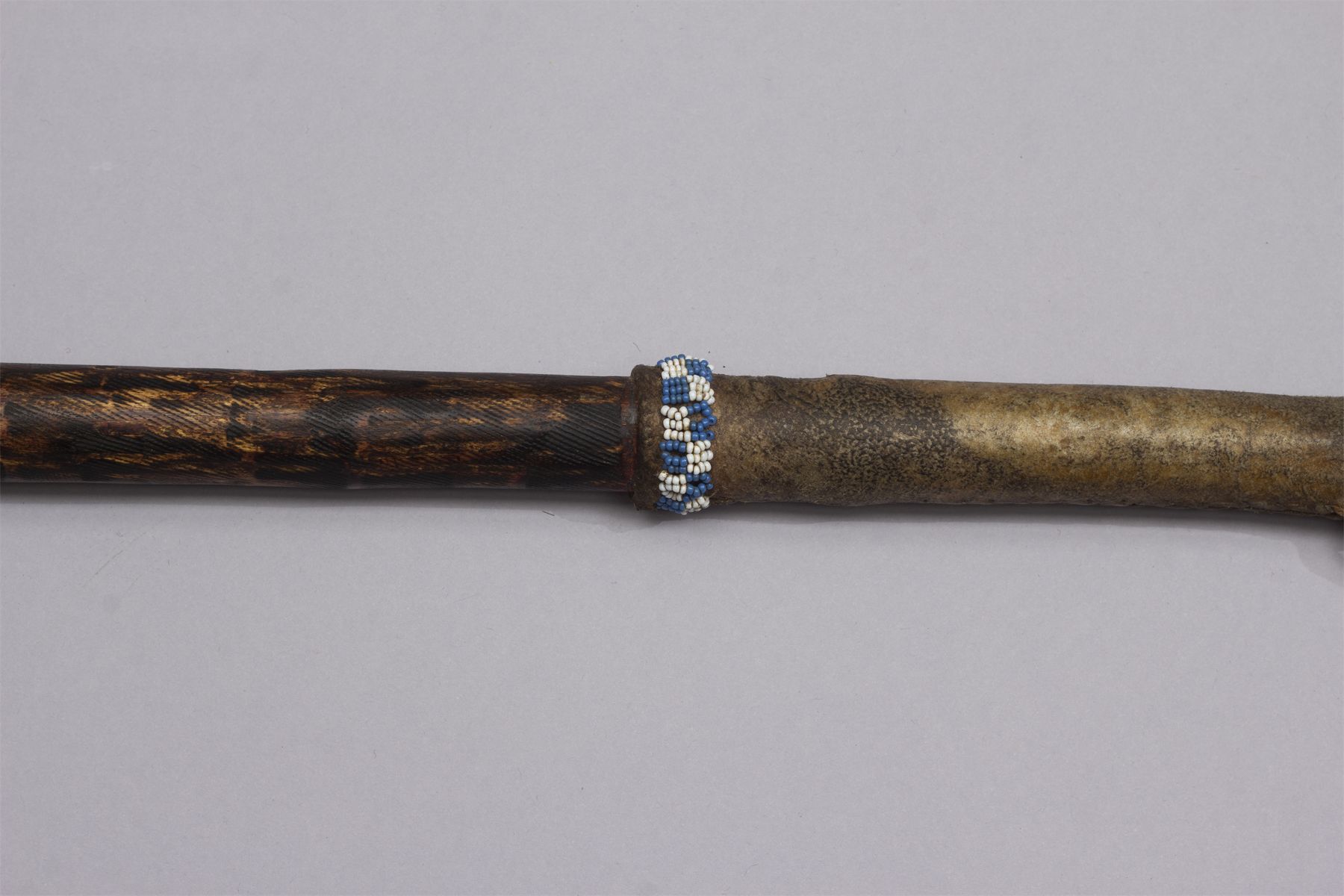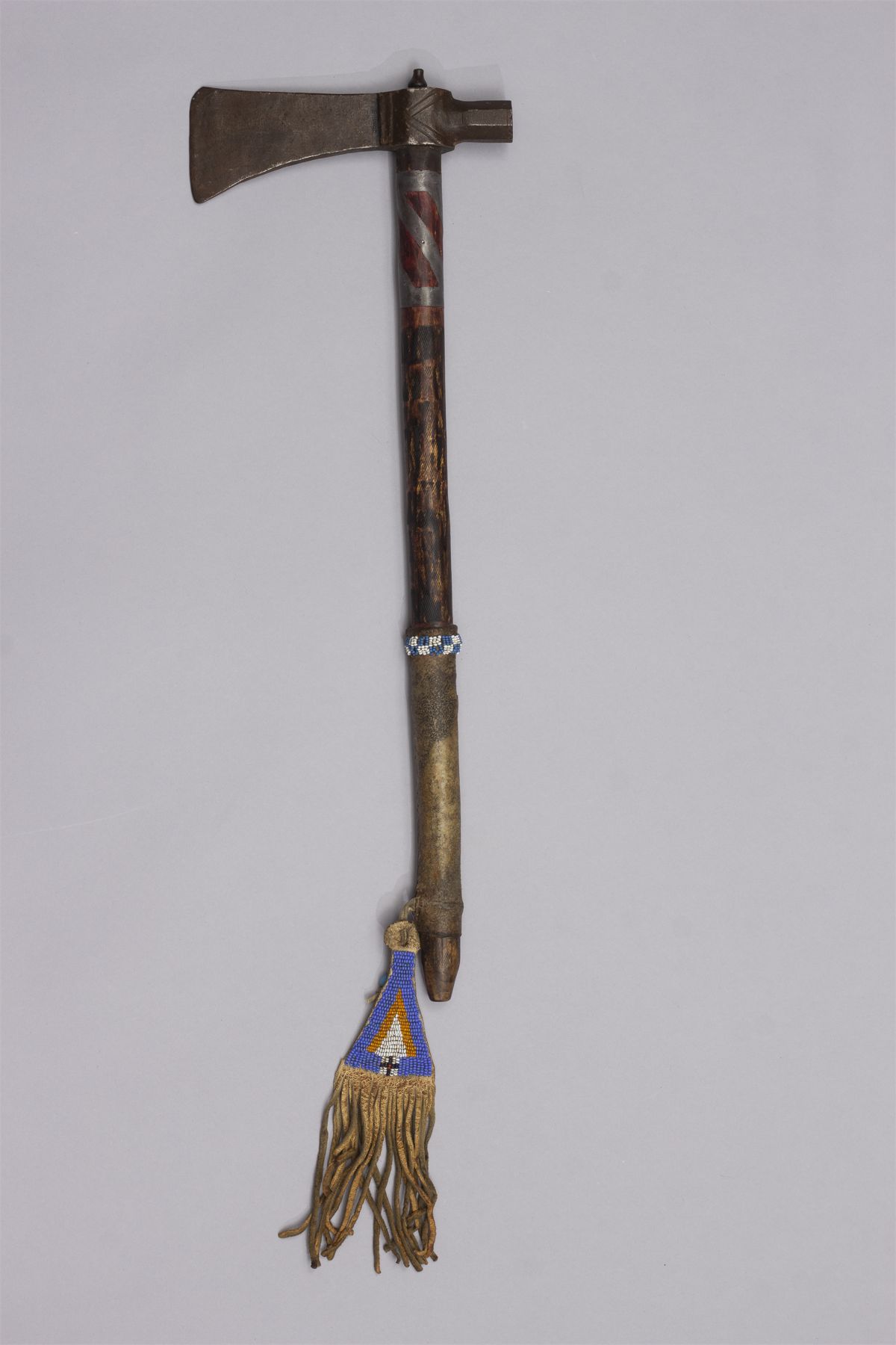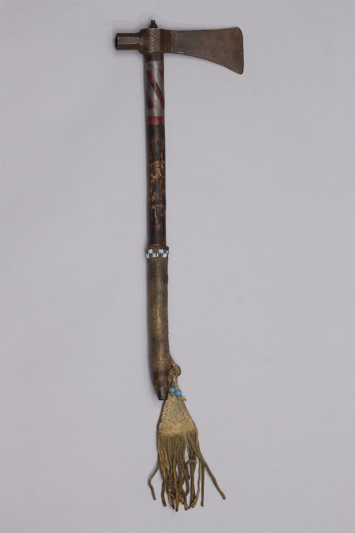 Early Pipe Tomahawk, Ca. 19th century. Blacksmith forged blade, octagon bowl, haft having pewter inlay, red ochre and file burns, wrapped with a hide handle and light blue, yellow, red and navy beaded fall.