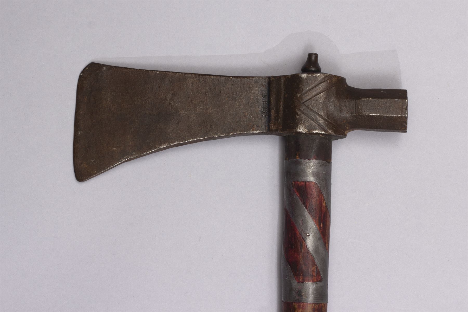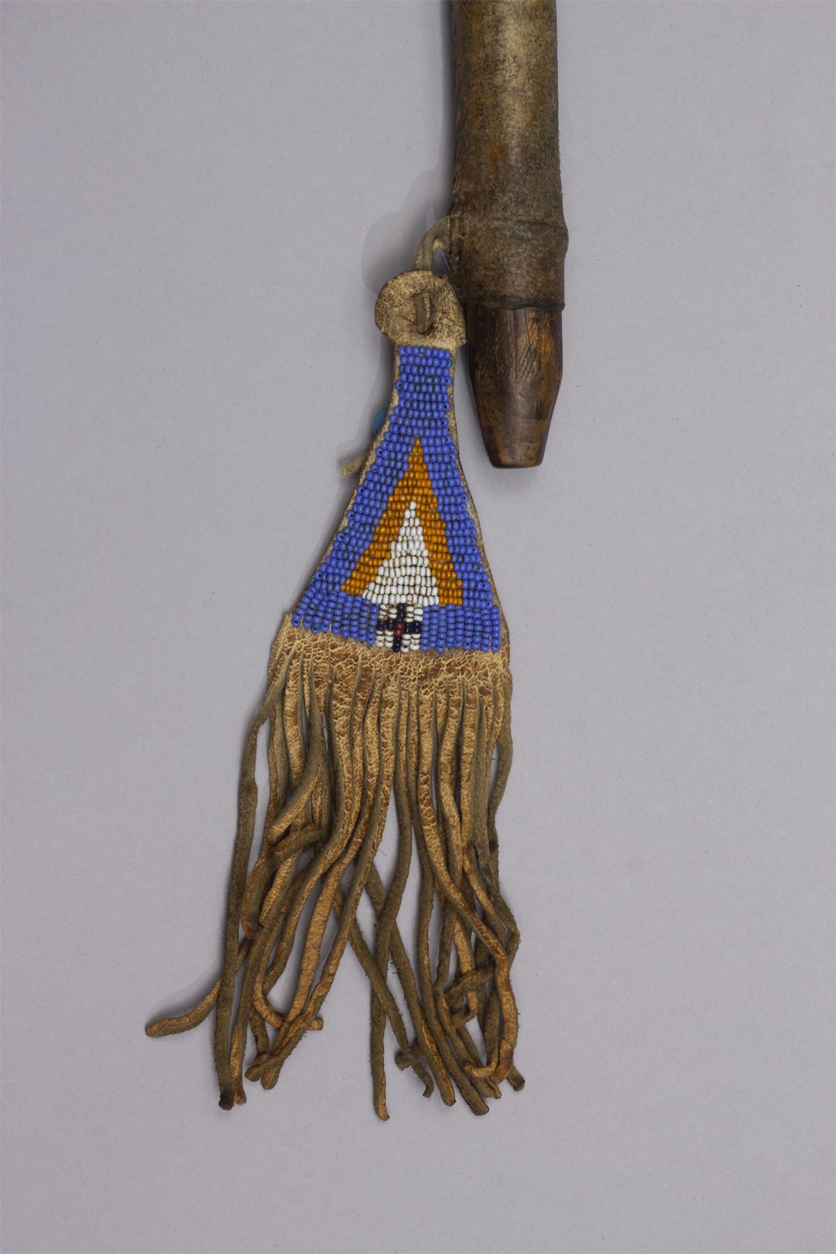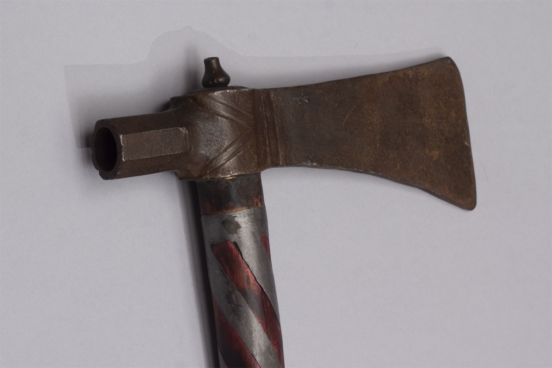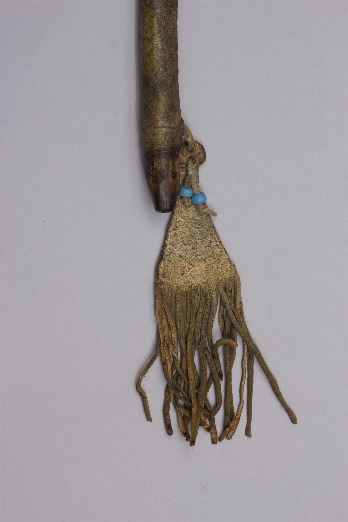 Early Pipe Tomahawk, Ca. 19th century. Blacksmith forged blade, octagon bowl, haft having pewter inlay, red ochre and file burns, wrapped with a hide handle and light blue, yellow, red and navy beaded fall.