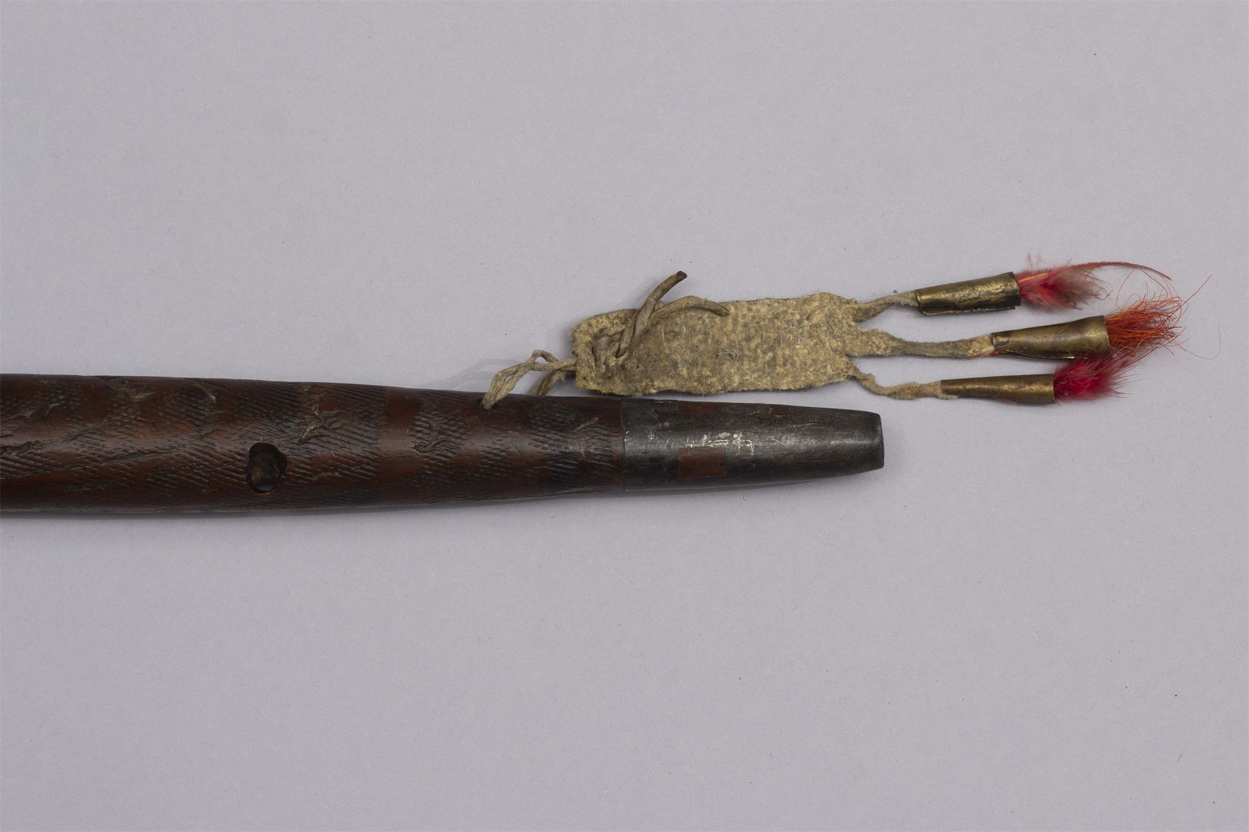Early Pipe Tomahawk, Ca. 19th century. Blacksmith forged blade and bowl, Fire brands on haft with file marks, inlay pewter tip. Small white, navy and light blue beaded fall with tin cones, wrapped red dyed feathers.