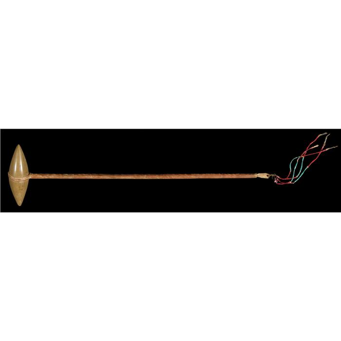 Early Plains War Club. 25" long. Dolomite stone head. Rawhide wrapped long handle. Ochre red. C. 1860. (est $1,000-2,000)