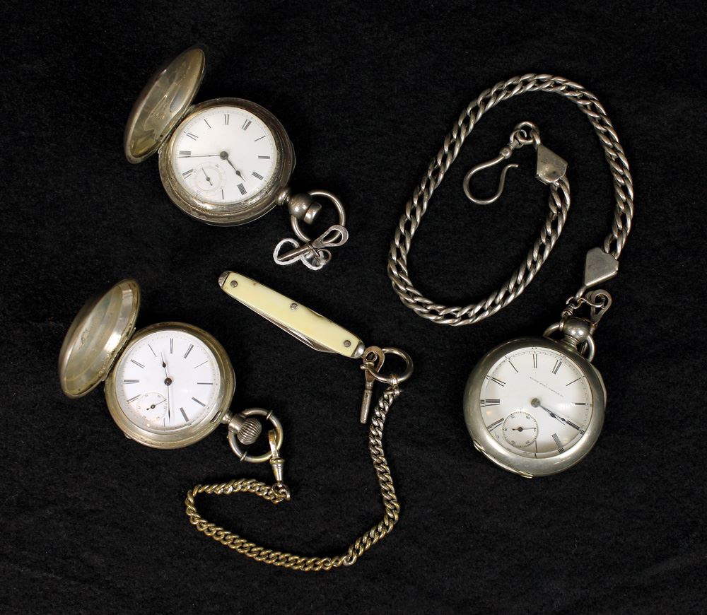 Lot of three early pocket watches; 1. Elgin with terrific silver chain. 2. Jacot with embossed covers, nice chain and pocket knife. 3. Newport with engraved lid and key.