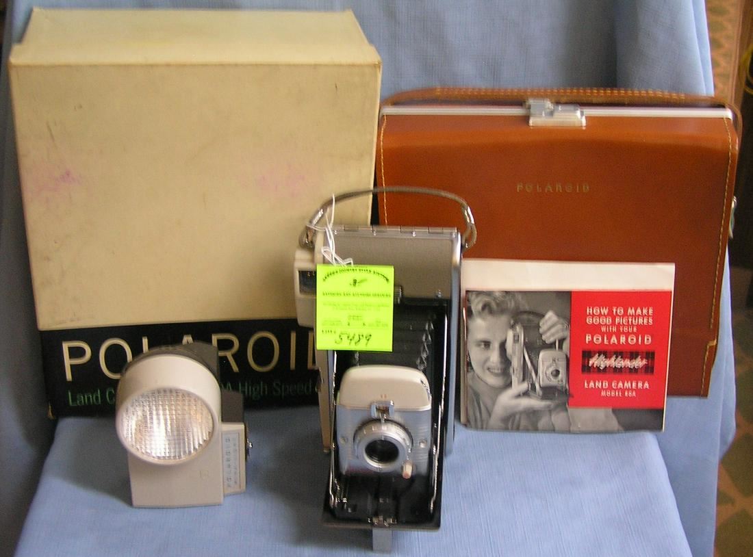 Early Polaroid highlander land camera model number 80A with model number 250 Polaroid wink flash kit mint condition with quality leather carrying case $150.00-$175.00