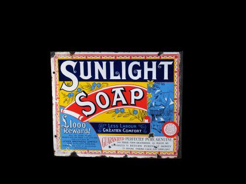 Early Porcelain Flange Advertising Sign "Sunlight Soap" Very Colorful, one-sided chips around edges Lever Bros. 15 x 18
