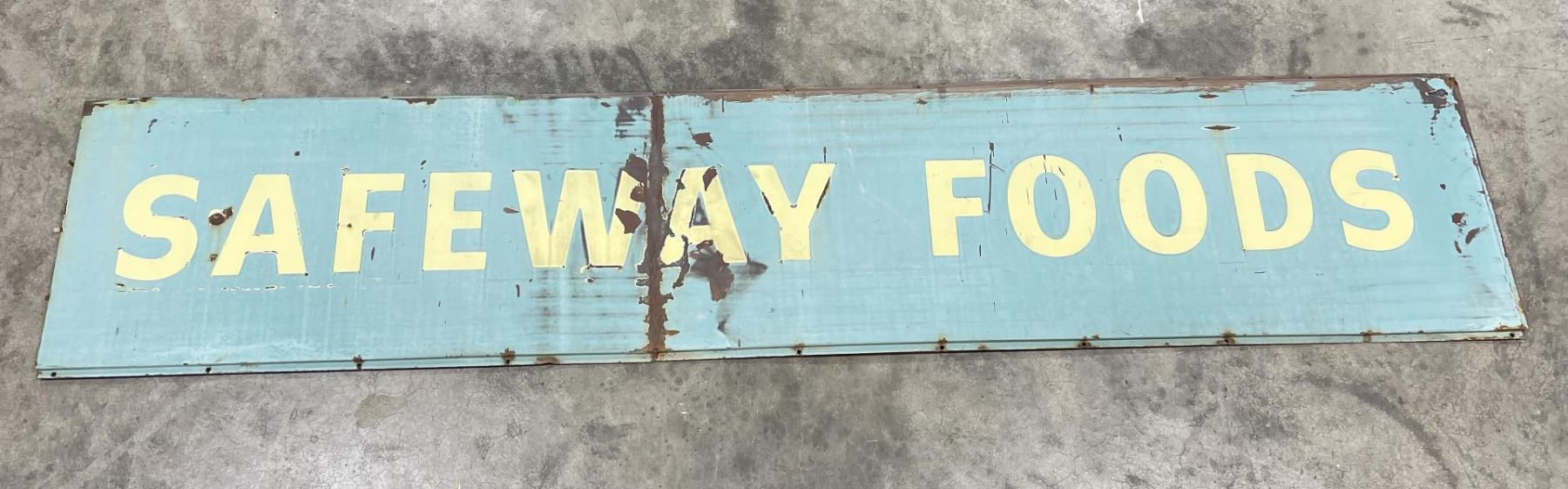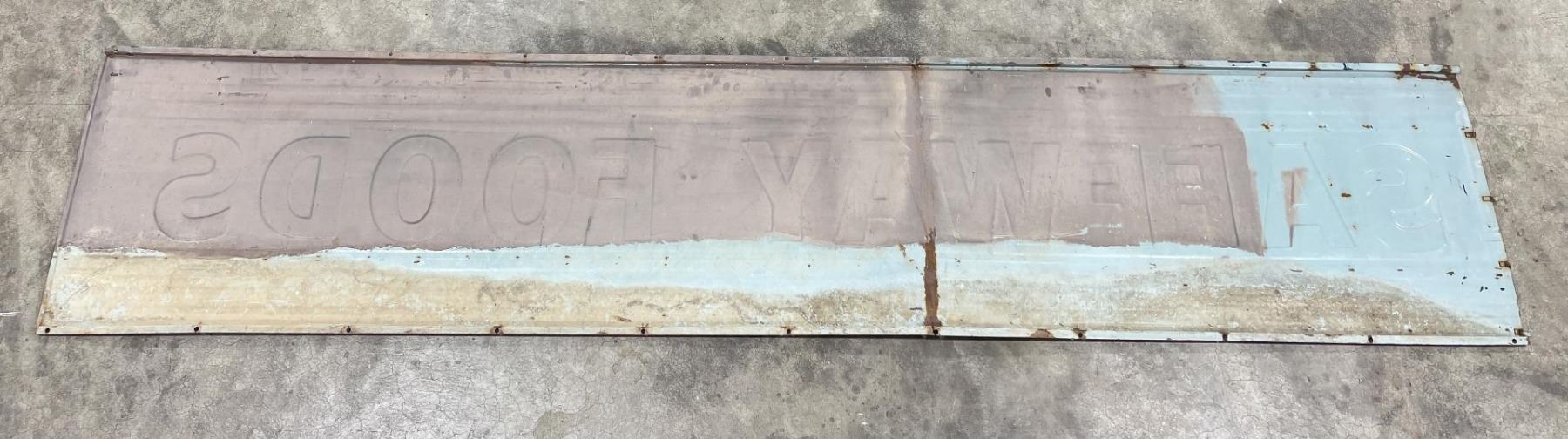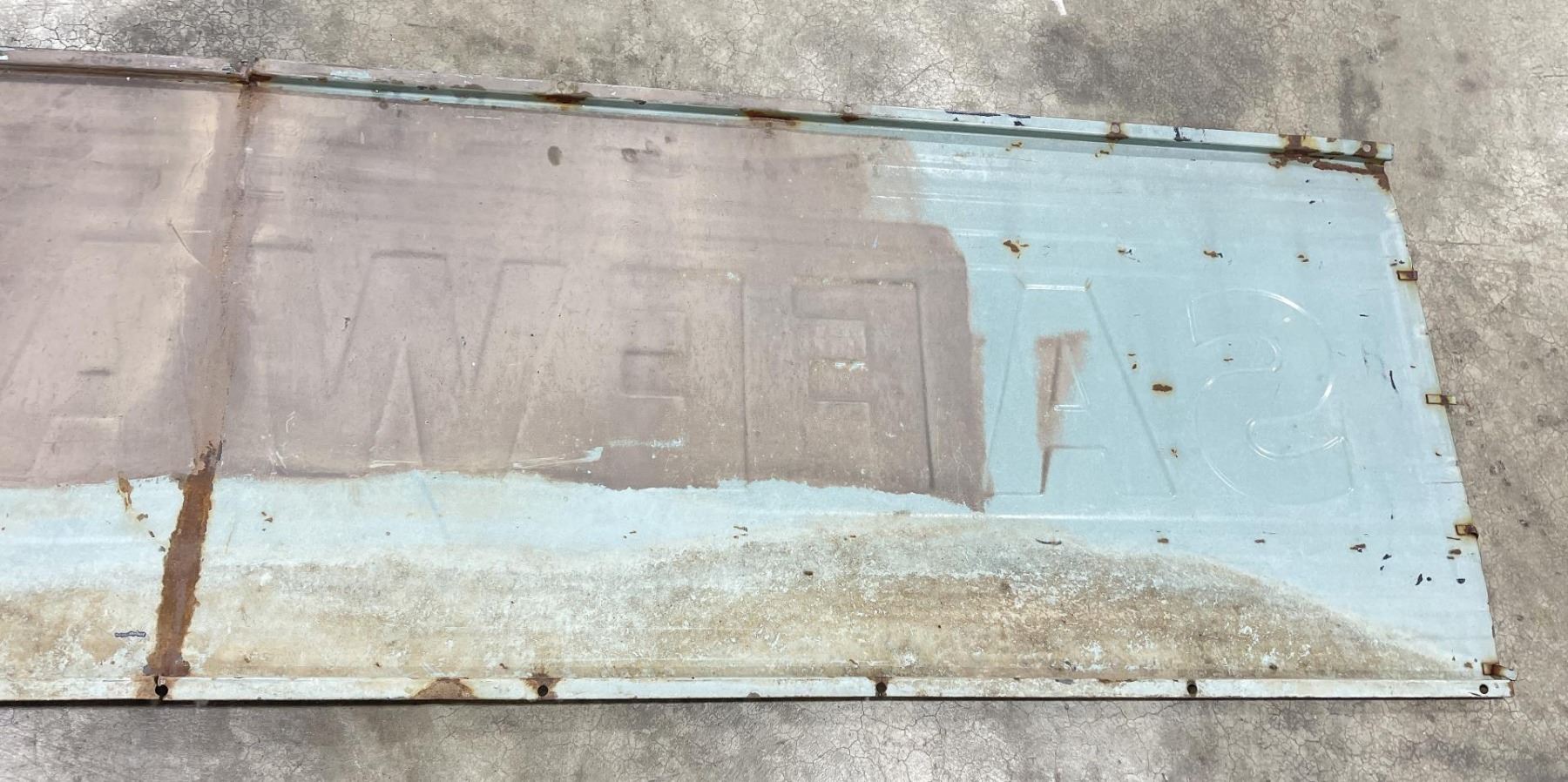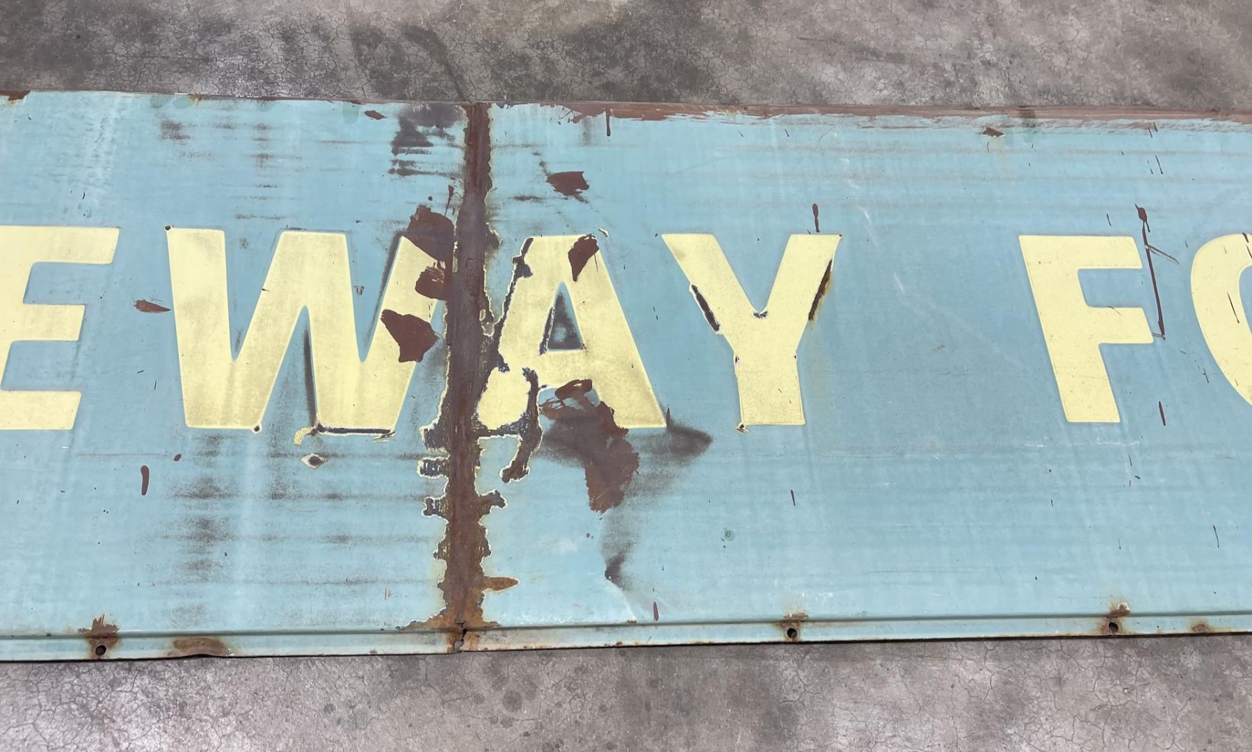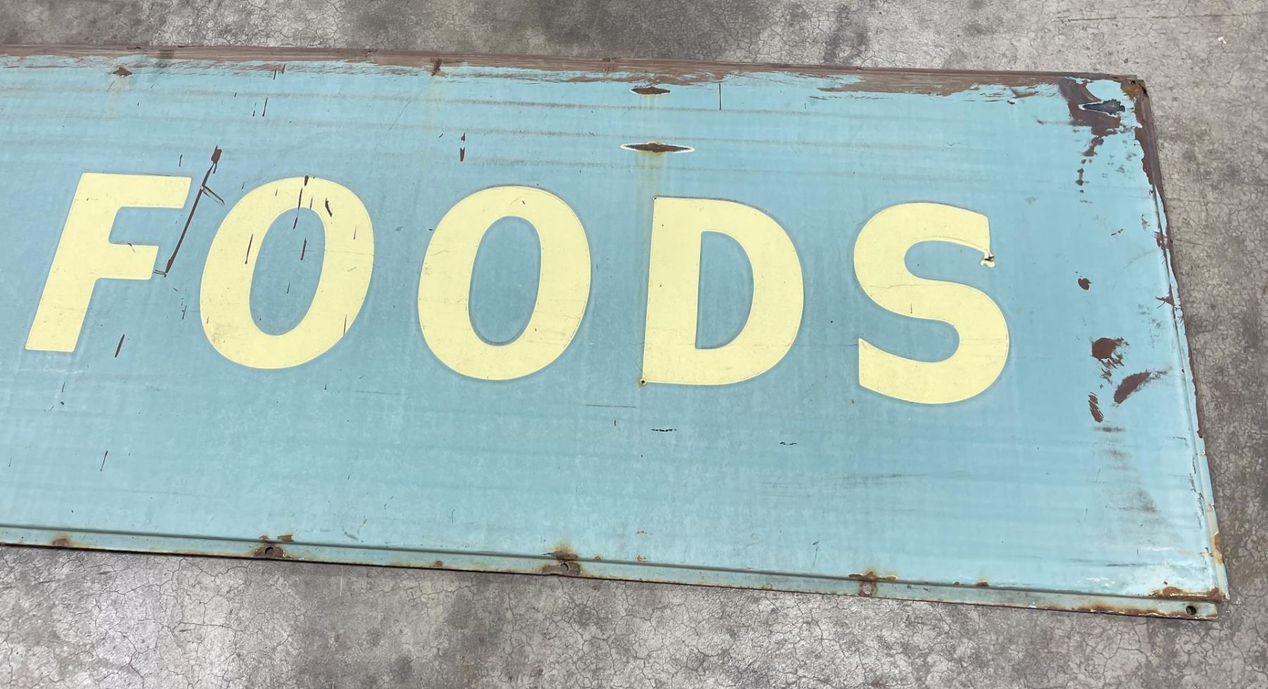 Nice early sign. Blue and white porcelain on steel. Has been folded in the center. 118" long, 24.5" wide.