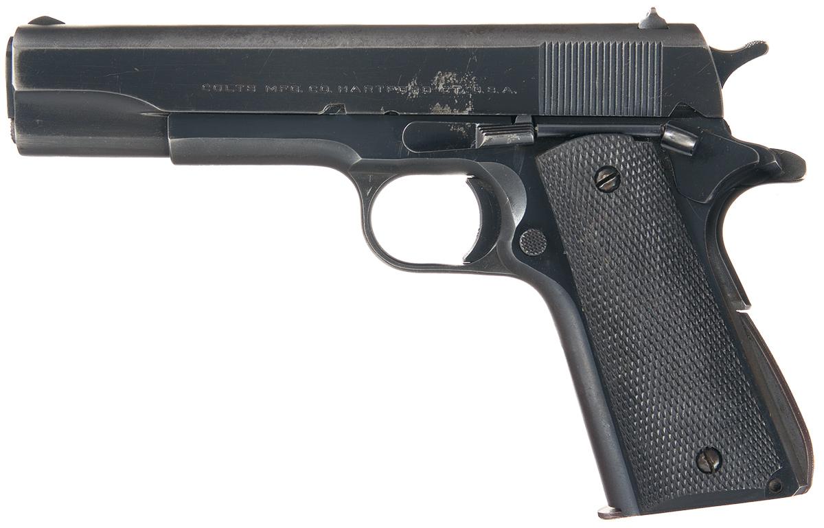Produced in 1947. Fixed sights, with the one line Hartford address on the left side of the slide and "COLT", "SUPER .38/ AUTOMATIC" on the right next to the Rampant Colt. Equipped with a serrated trigger, thin hammer, checkered thumb safety, long grip safety and arched serrated mainspring housing. Grips are checkered rubber.
