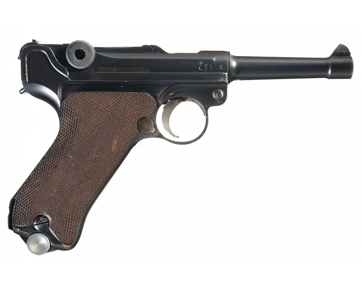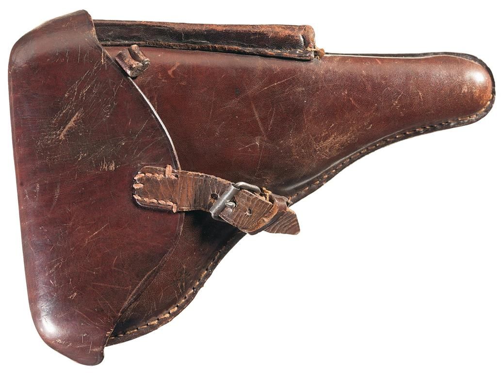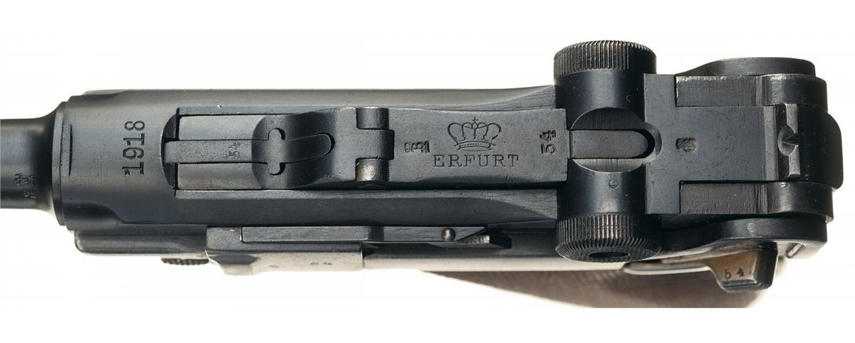 This is an example of a late WWI 1914 model, Erfurt Arsenal Luger that was subsequently reworked in the 1920s for the Weimar Police. The chamber is dated 1918, with the front toggle marked with the "Crown / ERFURT" logo. The right side of the barrel extension is stamped with three crown over a German Script letter proofs next to the Imperial Eagle proof. The left side of the barrel is stamped with a the "Crown/RC" proof next to an early Eagle/33 Simson proof with a Simson Eagle firing proof on the underside, next to the serial number and the bore diameter marking. The various parts are all correctly marked with the last two digits of the serial number along with a Crown/Script letter proof on many of the parts. Correct military style numbering with the full serial number on the major components with the last two digits on the small parts. The Police spring bar is on top of the side plate. It has the fixed standard sights and is fitted with one nickel plated magazine with the aluminum base that is marked: "1/8054". It is complete with an early all brown leather holster that is marked on the back side: "JULIUS SCHLOSS/BERLIN.O.17/1915". The back of the holster has been correctly modified by the addition of a single "D" ring in between the belt loops for use with a shoulder strap, typically of what was used by Police in the Weimar era.