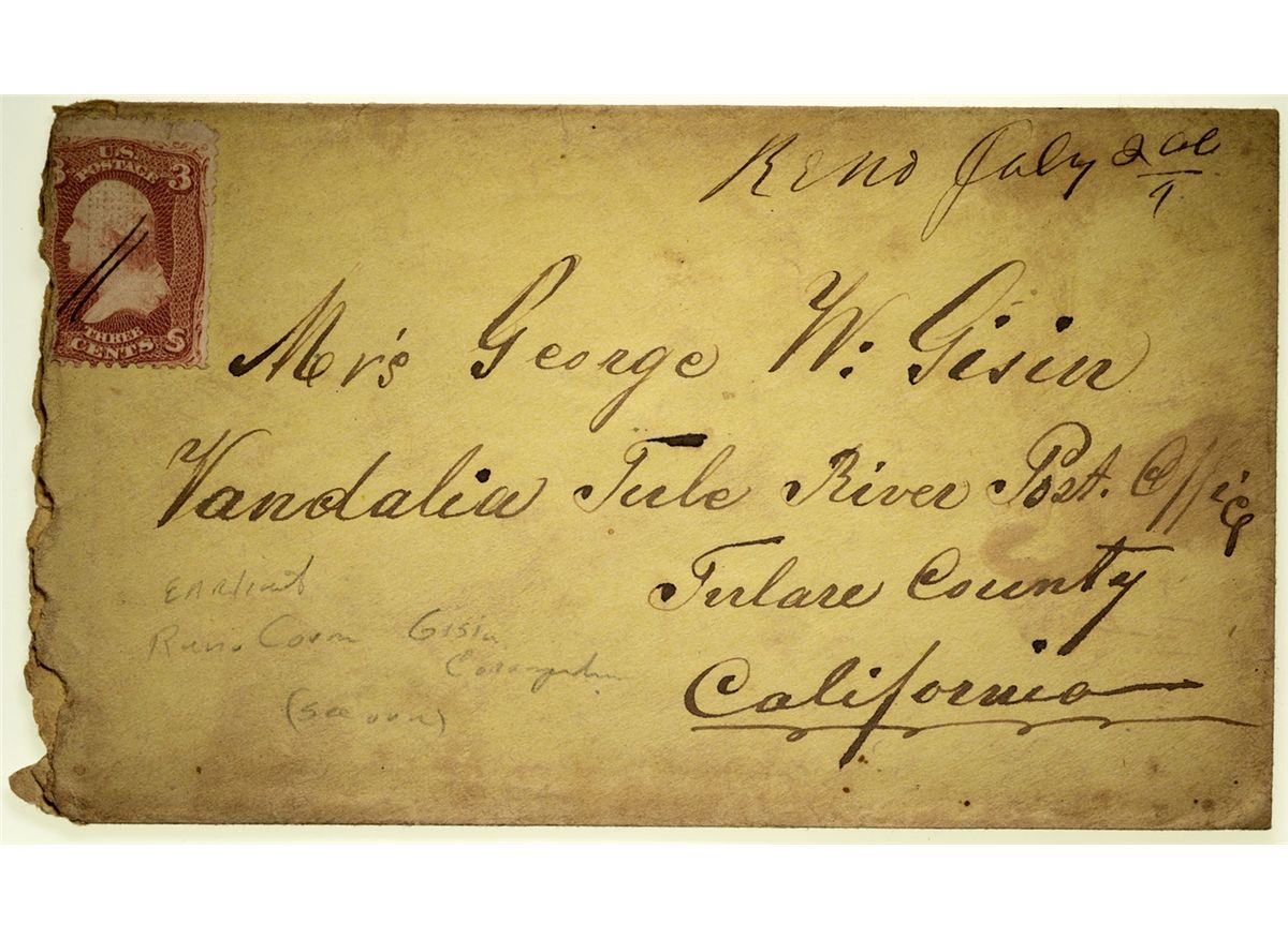 Thought to be the first known Reno cover, addressed to Mrs. George W. Gisin in Tulare County California. 5.25" x 3." - Jacobitz Collection -59876