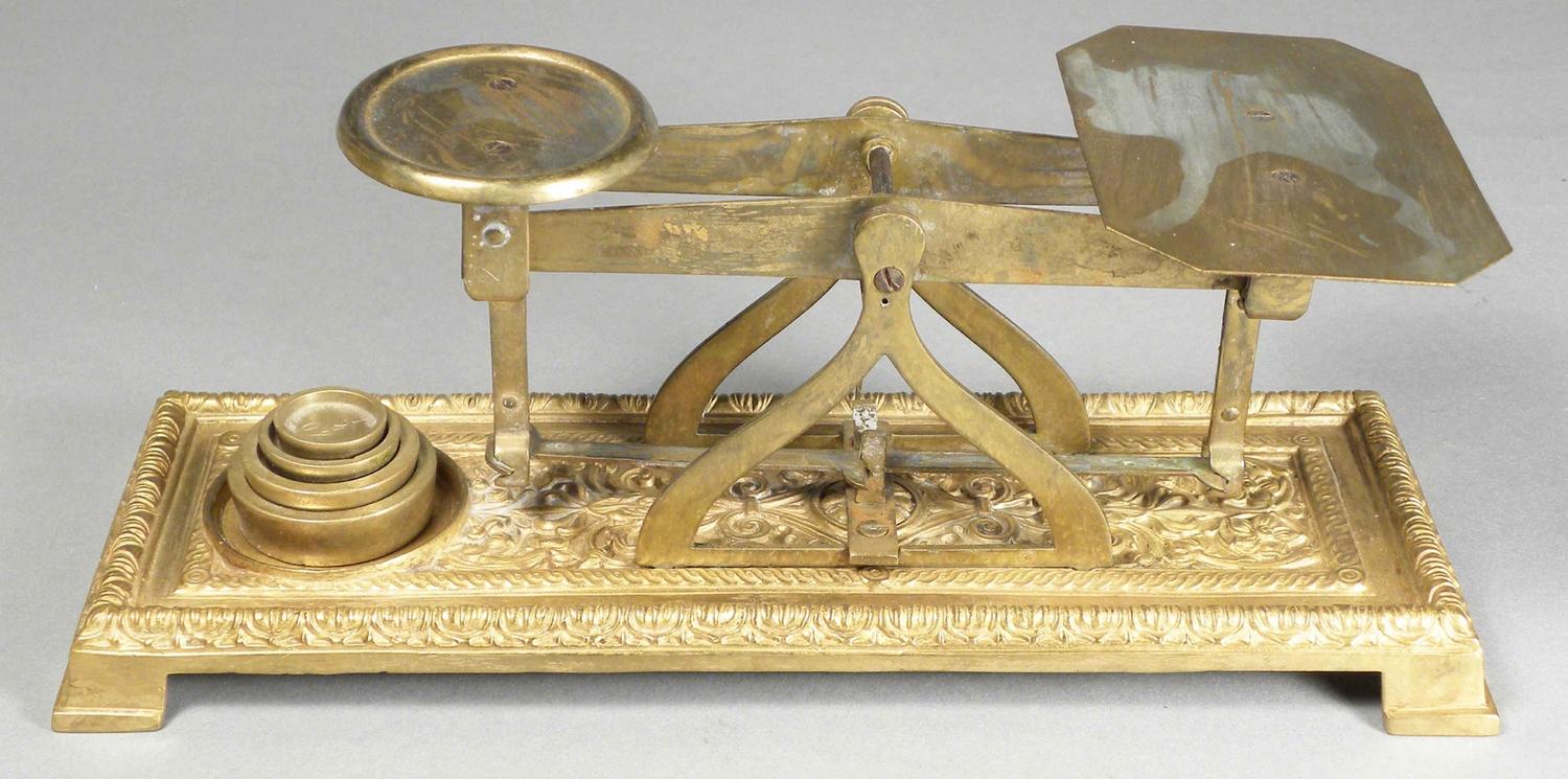 Early Postal Scale. Gold tone cast iron base, comes with set of weights. 9 X 3 1/2 X 3 1/4 inches. Starting bid $30