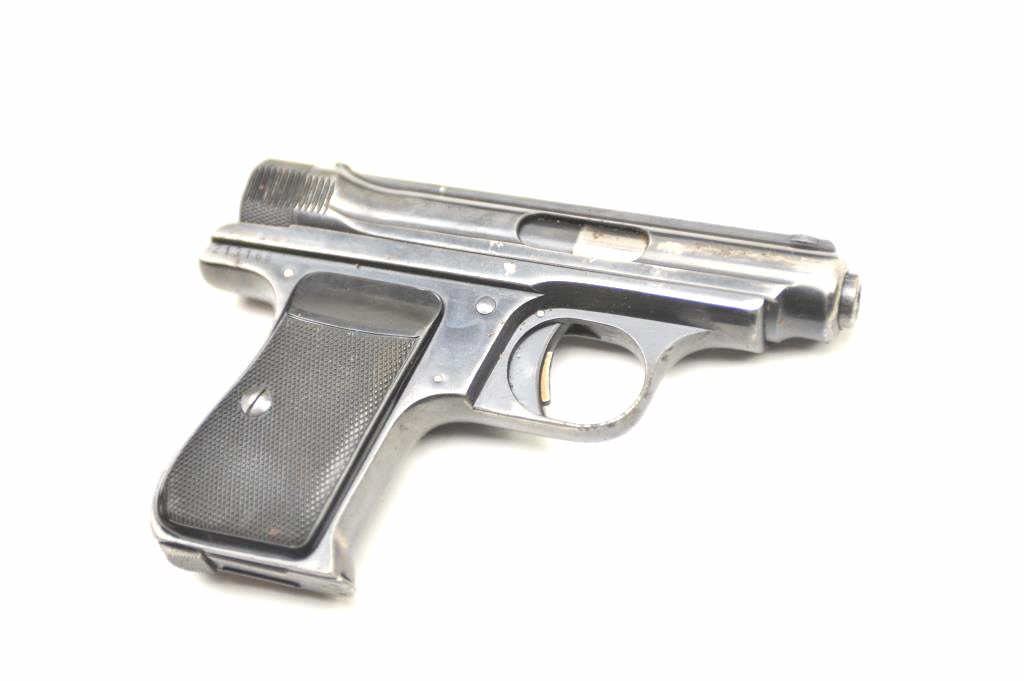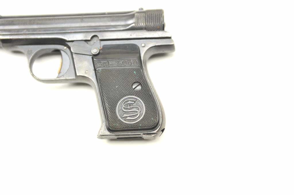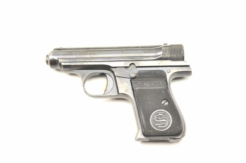 Early Pre-War J.P. Sauer and Sohn Semi-Auto Pistol in .32 caliber with “K” and sunburst proof of the left front bow of the guard. 80%-90% original blue with spotting, light erosion and beginning pinprick pitting.Magazine numbered to match with Sauer manufacturing marks. Holster is also #213168 to match pistol and extra mag #153 with Sauer marks. Holster worn but fair to good. Most likely pre-war criminal police issue orpurchase by officer. (C&R/PPT) Est.: $350-$700