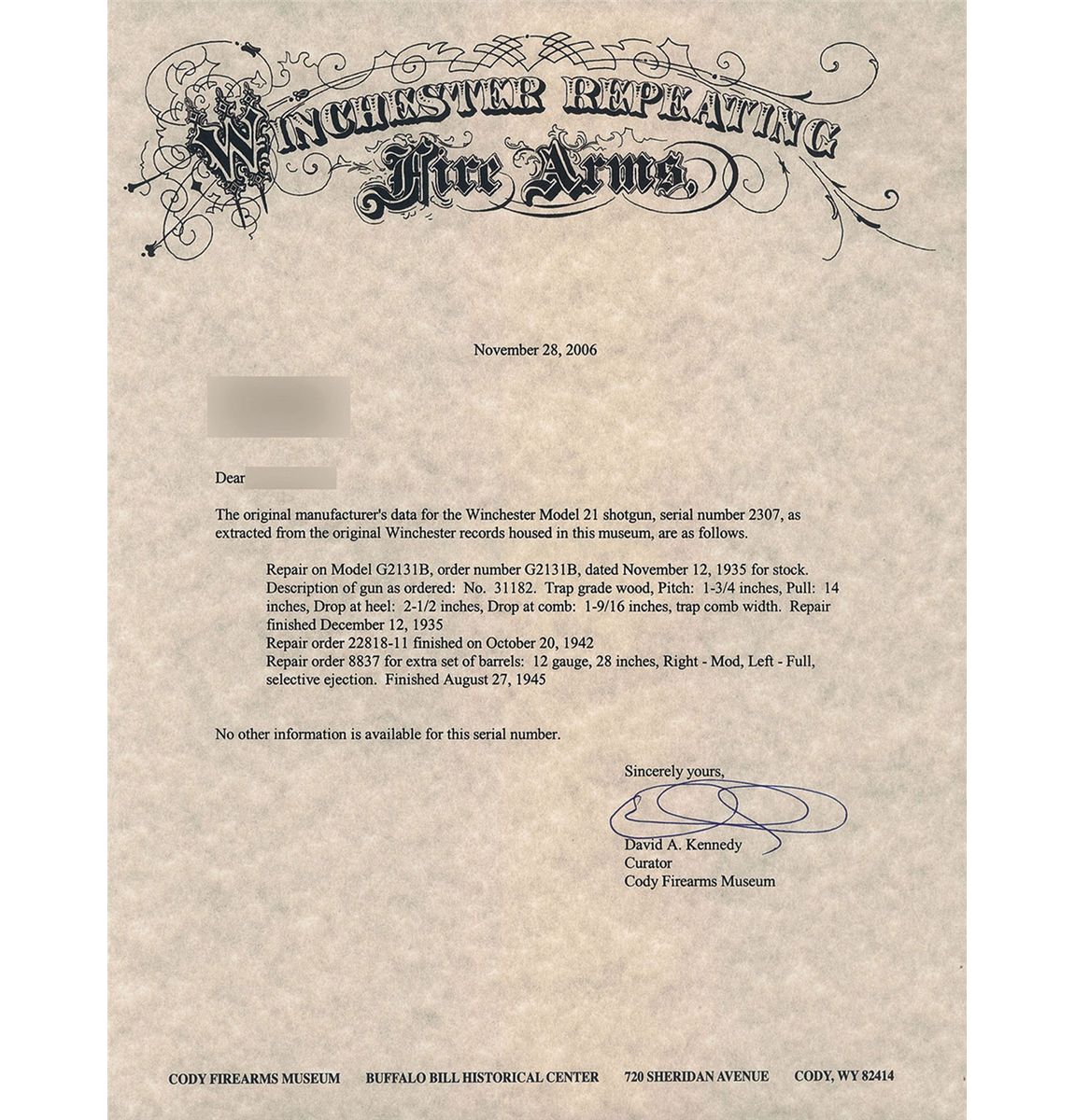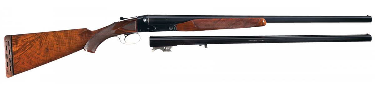 Manufactured in 1934. Red bead front sight, choked "WS-1" and "WS-2", 2 3/4 inch chambers with ejectors. Single selective trigger and tang safety switch. The trigger plate is marked "TRAP" above the screw and "SKEET" below the screw. Mounted on a nicely figured checkered walnut forearm and pistol grip stock with recoil pad. Length of pull is 14 1/8 inches. With factory letter dated November 28th, 2006 stating that on November 12th, 1935 it was sent in for Trap grade wood "Pitch: 1-3/4 inches, Pull: 14 inches, Drop at heel: 2-1/2 inches, Drop at comb: 1-9/16 inches, trap comb width. Repair finished December 12, 1935", "Repair order 22828-11 finished on October 20, 1942", "Repair order 8837 for extra set of barrels: 12 gauge, 28 inches, Right - Mod, Left - Full, selective ejection. Finished August 27, 1945" and "No other information is available for this serial number.". With a leather leg of mutton case and an extra set of 26 inch solid rib barrels numbered to the gun, chokes are marked "MOD." and "FULL" but gauge at improved modified/improved cylinder.