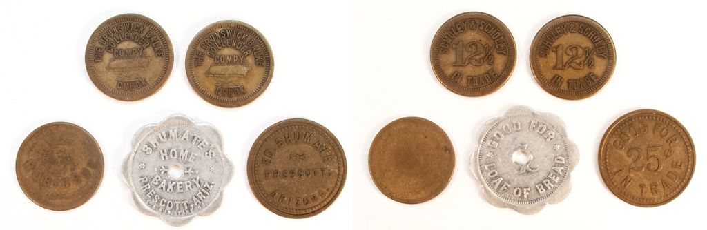 (5) A.W. ROBINSON Brass, ED SHUMATE // 25¢ Brass, SHUMATE'S HOME BAKERY // 1 LOAF OF BREAD Scalloped (8) Aluminum Holed as made, (2) SCHOLEY & SCHOLEY 12½¢ // BBC Brass