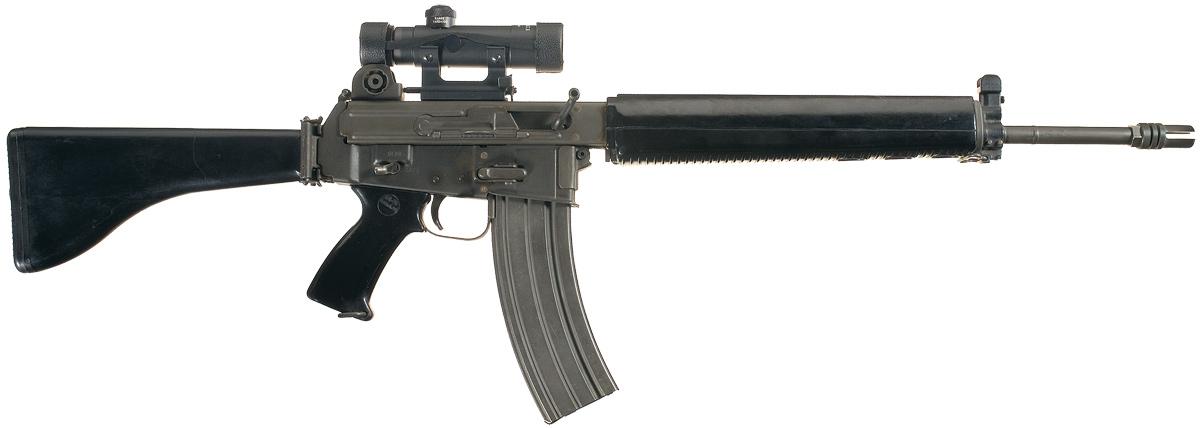 This is an example of the original Armalite AR-180 semi-auto rifle as manufactured in Costa Mesa, California. This version is semi-automatic only. Barrel has the original steel three-pronged flash suppressor, semi-hooded post sight, bayonet lug, ventilated forearm, folding adjustable rear peep sights, spring loaded port cover, ambidextrous two-position safety, synthetic folding stock and pistol grip. Three extra magazines are included. With an Armalite 2 3/4x 20mm scope and lens covers.