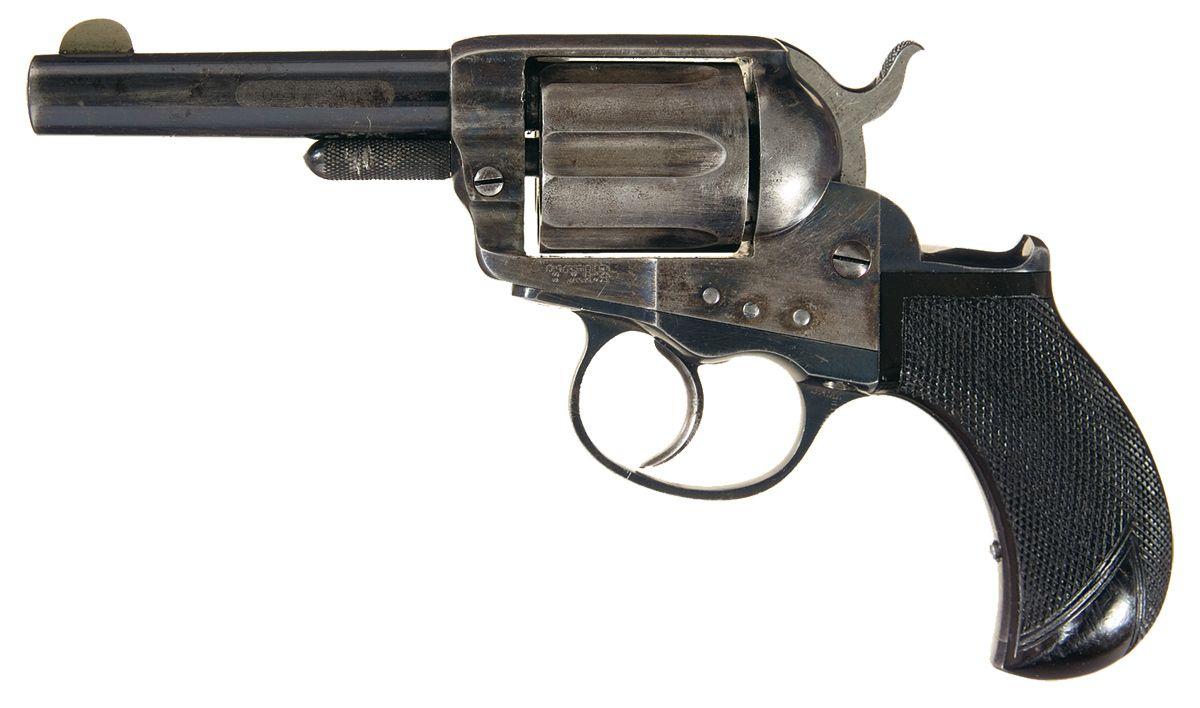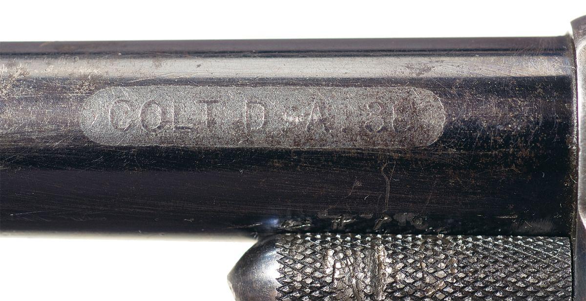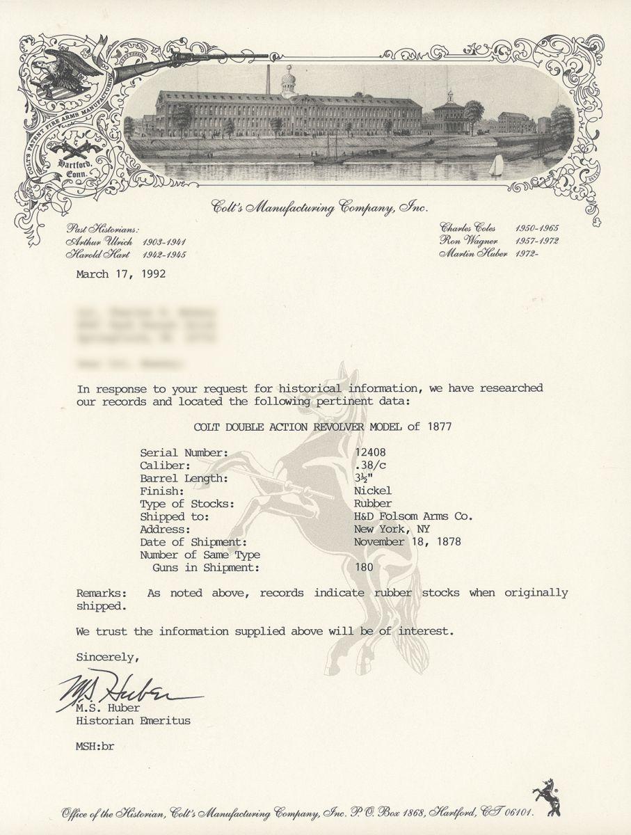 Manufactured in 1878, with standard markings and features. Complete with factory letter that verifies the serial number and configuration, but lists the grips as rubber (writer believes this is a records error because rosewood was standard on the early models, and there is no pin as used for two piece grips). It was shipped as 1 of a shipment 180 revolvers to H&D Folsom Arms Co., New York, N.Y. on November 18, 1878.