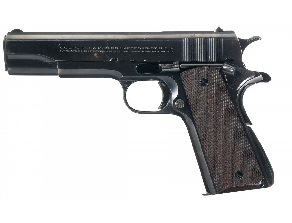 This example of a Colt 38 Super Auto was manufactured in 1929. The right side of the matching numbered slide is marked "COLT SUPER 38/AUTOMATIC" followed by the Rampant Colt motif and numbered "49/30" under the firing pin retainer. The left side of the slide has Colt's address above the 1897-1913 patent dates in two lines. The upper left front of the trigger guard bow is marked with a "1" over the triangle "VP" and the right side is marked "60". Features include standard fixed low profile sights, blue barrel with polished chamber, checkered slide release and thumb safety, checkered milled trigger, checkered wide hammer, arched main spring housing and checkered walnut grips without diamond patterns around the screw holes. This pistol is complete with an original two tone magazine marked "COLT SUPER/38 AUTO" on the bottom of the base. Included with the pistol is a plastic Douglas Industries egg crate foam lined case for storage.