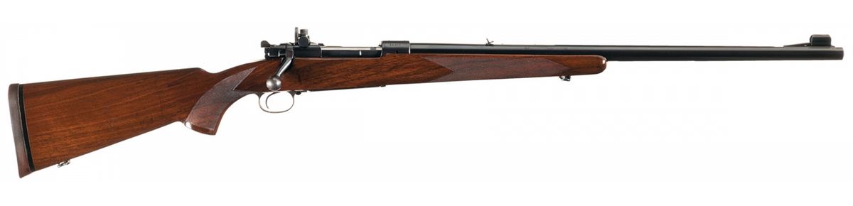 This is a rare early example of a Model 70 rifle in 375 H&H Magnum as manufactured in 1937 when the 375 H&H Magnum caliber was first introduced to the line of Winchester Model 70 rifles. In the book "THE MODEL 70 WINCHESTER 1937-1964" by Dean Whitaker refers to these rifles as the "Model 70 375 Type 2." These rifles, like this example, have barrels that resemble the Target barrel in contour and muzzle configuration with a number having been tapped for scope blocks. All barrels will have a ramp front sight. The rifles are very rare and are encountered in the serial number range below 95,000. The left side of the barrel has standard Winchester markings followed by "375 MAGNUM", the first style caliber designation stamp for the 375 H&H Magnum. The right side of the barrel has the two line Winchester address. The Winchester factory proof is stamped on the barrel and receiver at the breech. Hooded ramp front sight, two leaf folding rear sight with the area ahead of the rear sight tapped for scope mounting and the receiver has a Lyman sight. Cloverleaf receiver tang, hinged floor plate and pre-war safety. The polished bolt is numbered to the gun. The sporting type straight comb pistol grip stock has checkering, sling swivels and a solid Winchester recoil pad.