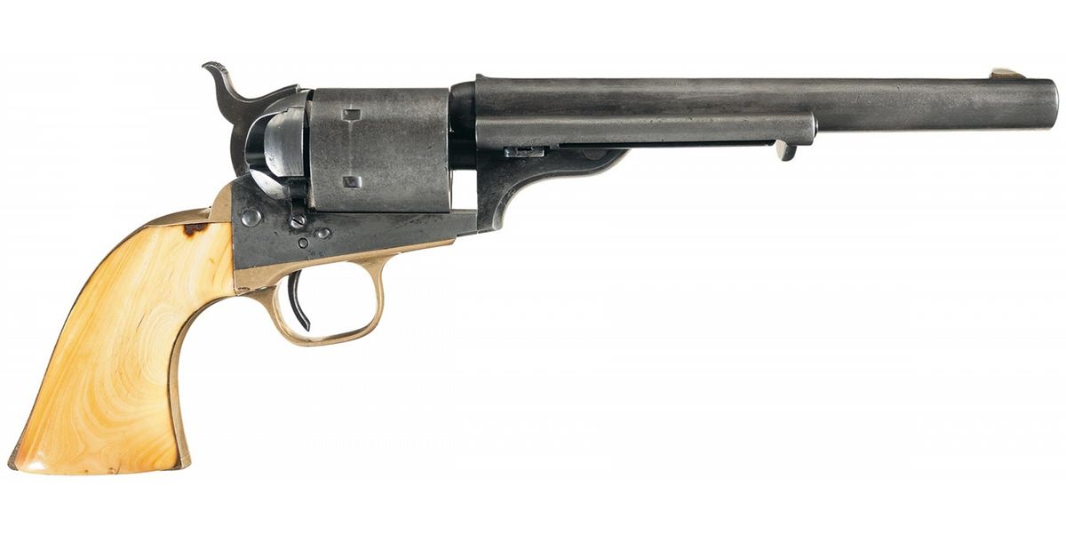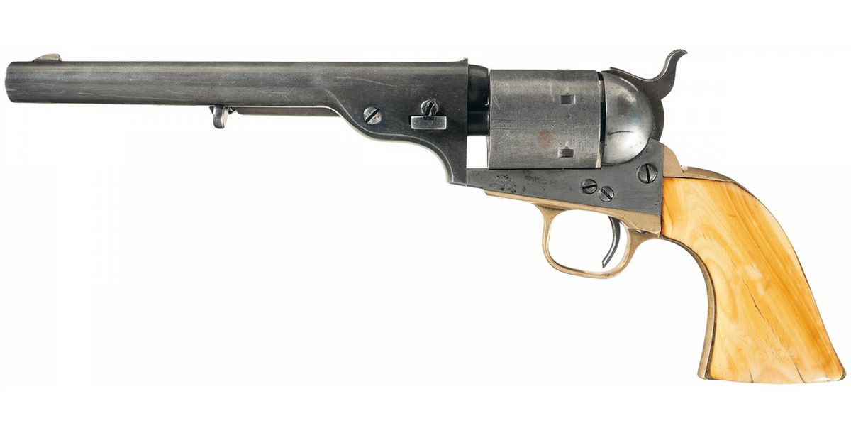 Manufactured circa 1872-1873, this was one of approximately only 7,000 Model 1871-1872 open top revolvers manufactured. The Model 1871-1872 was the first non-conversion Colt cartridge revolver, and was a direct predecessor of the hugely successful Colt Single Action Army Revolver. The top of the barrel is marked "-- ADDRESS COL. SAML COLT NEW - YORK U.S. AMERICA --", the left side of the frame is marked "COLTS/PATENT", the cylinder is roll engraved with the Texas naval scene and "COLTS PATENT No "345". The matching serial number is marked on the barrel, frame, trigger guard and back strap. The loading gate, cylinder and cylinder pin are numbered "26", and the wedge is un-numbered. Fitted with a one piece smooth ivory grip.