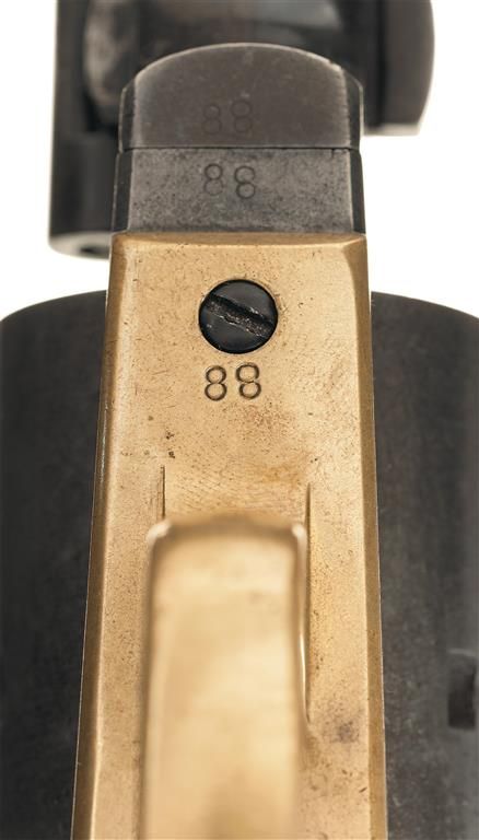 Good as refinished overall. The metal surfaces have a smooth mottled gray patina with finish remaining over minor pitting. The brass has a very pleasant aged patina. The cylinder scene is extremely light due to buffing. The remaining markings are clear. The grip is fine showing some shrinkage, small chips around the edges, some minor age cracking and an attractive grain with a pleasant caramel color. The action is excellent.