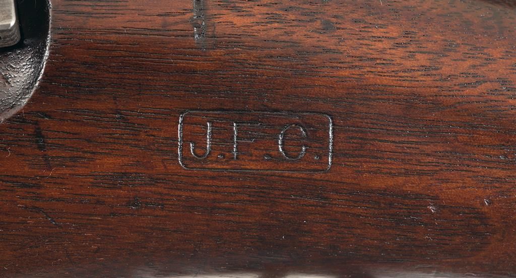 Very fine with 75% plus of the original blue finish. Most of the wear is concentrated on the upper barrel band which has about 40% of the blue finish and the buttplate which has a silver-gray patina with scattered pitting. The blue finish on the bolt extractor shows typical cycling wear. The trigger guard and floor plate retain 85% plus of the original blue finish. The stock and handguard are both in very fine condition with scattered, handling and storage marks. The "J.F.C." final inspection mark and "P" proofmark are sharp. This is an excellent original example of an early Springfield Model 1903 rifle with 1906 Alterations.