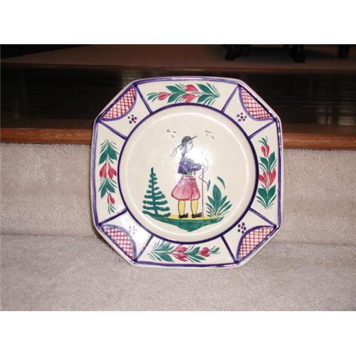 Early Quimper (Kemper) Plate. The front pictures a Gentleman with a pole in hand. This is the typical older Quimper design. The plate measures 9in.X 9in. The back is signed and numbered. There is one small chip to the back surface, but this is not seen from the front. Great for Quimper collectors.