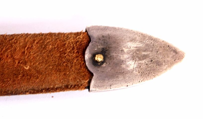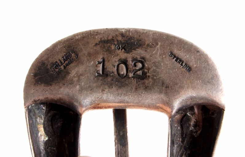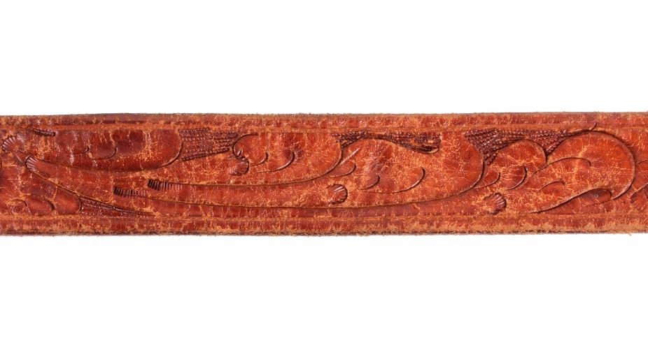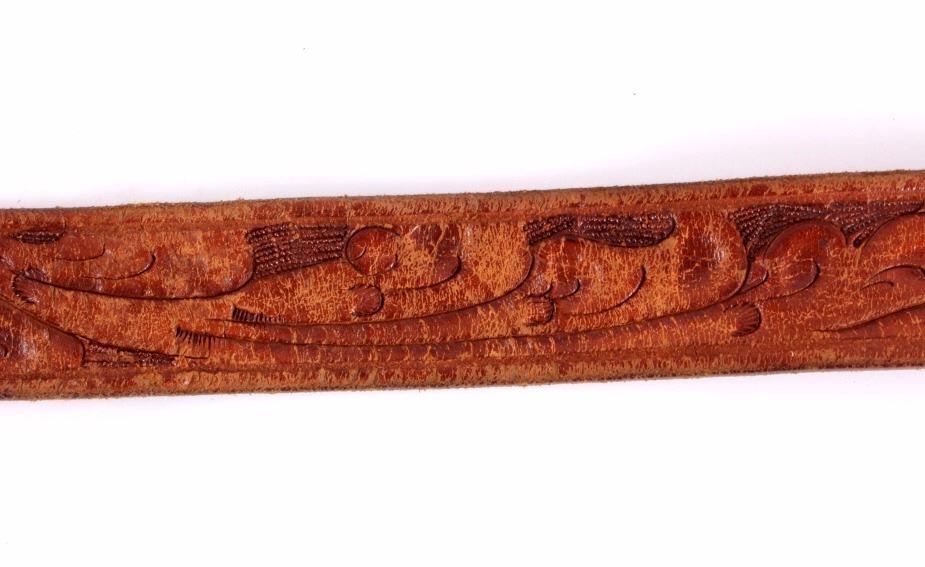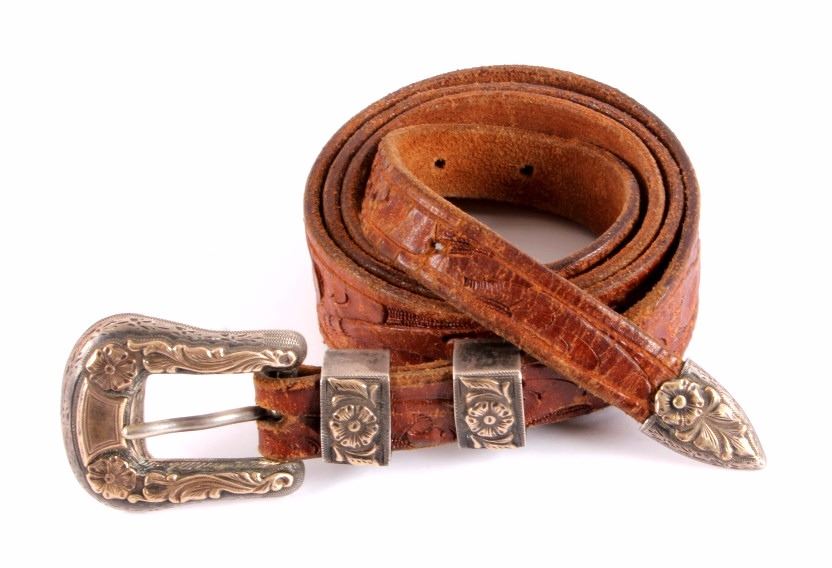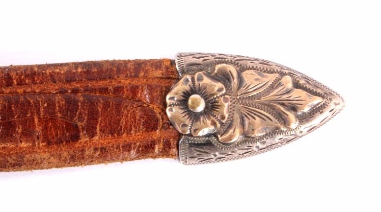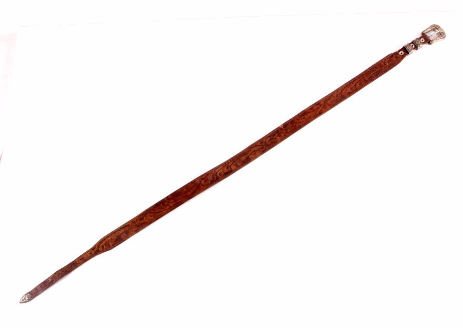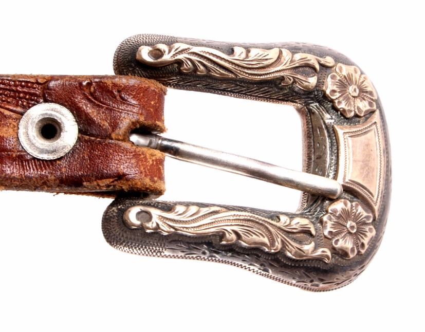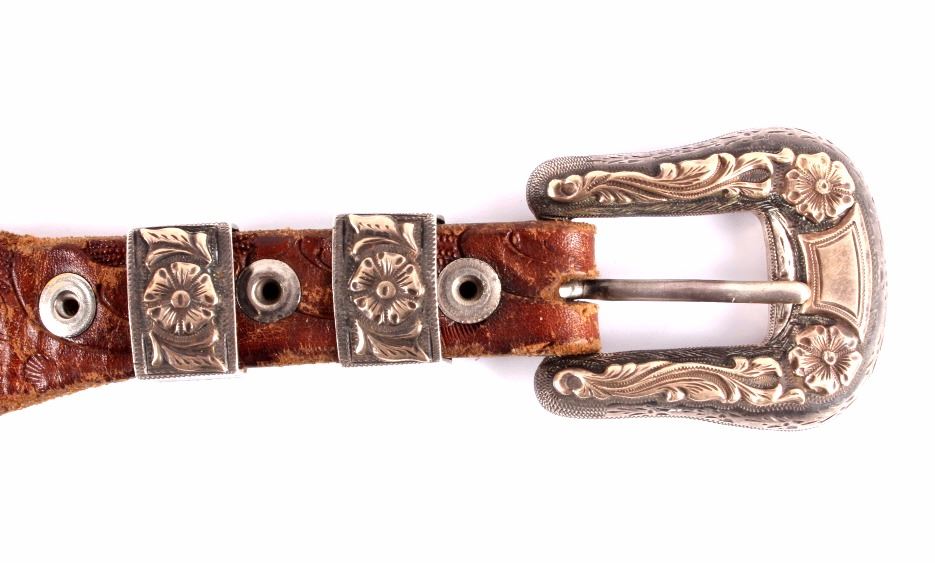 This is a Western tooled leather belt and sterling silver and 14K gold ranger buckle set. The ranger set includes the buckle, two keepers and the belt tip. Each piece is made from solid sterling silver with 14K gold overlay with a beautifully tooled floral design. The back of the buckle is marked "Hollands San Angelo / 14K / 102 / Sterling". The belt shows a similar design with carved and stamped workmanship. The belt and ranger buckle set are in good condition. The buckle measures 1.75" x 2" and the belt is 42" long overall