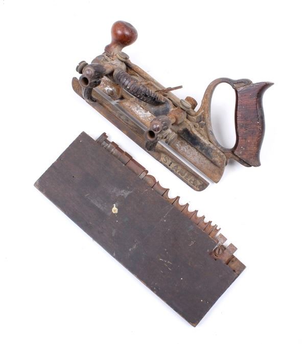 Available for your bidding pleasure we have an antique Stanley 45 Wood Plane. This is Stanley's most popular and famous combination plane. A combination plane is one that can be fitted with different irons, or blades, and be adjusted for a particular cut. This plane has "45 Stanley" marked on one side, and a unique floral design on the other. It does show some rust but overall is in good condition. It measures 6 1/2" tall, 10 1/2" long, 5" wide.