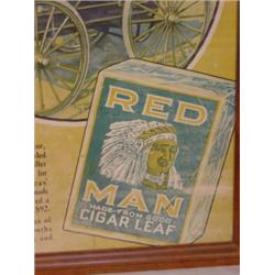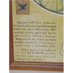 Early Redman tobacco advertisement poster in frame. Poster features two gentlemen in Dureas' "Buggyant" gasoline automobile. Measures 43 1/4" x 28 3/4" framed.