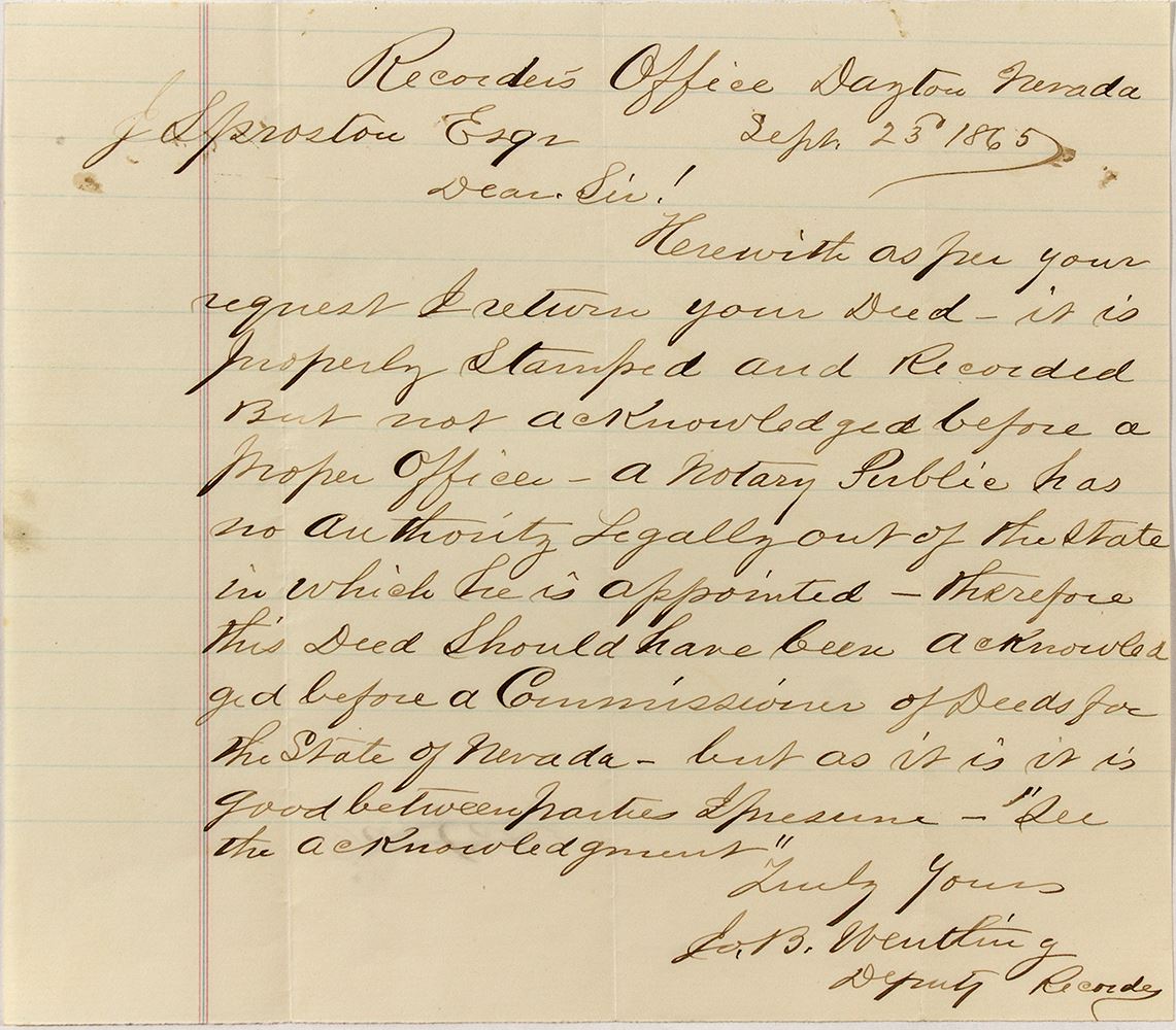 An interesting document that is a great example of the problem of title that occurred in gold mining camps. Dateline Dayton, Nevada, Spet. 25, 1865. The deputy recorder is informing J. Sprostou (?) that his deed was "properly stamped and recorded but not acknowledged before a proper office" given that "a notary public has no authority legally out of the state in which he is appointed." Given this was issued in Dayton, this could have been for a Comstock mining claim. 7.5" x 8"