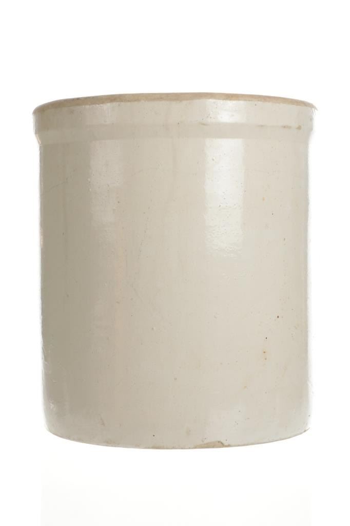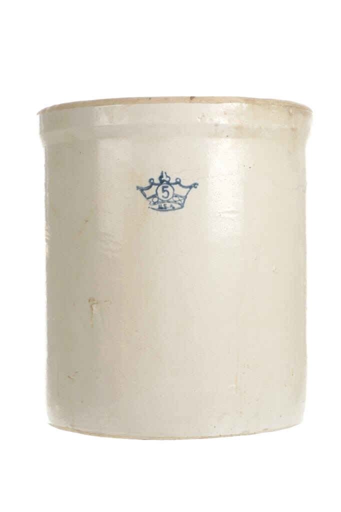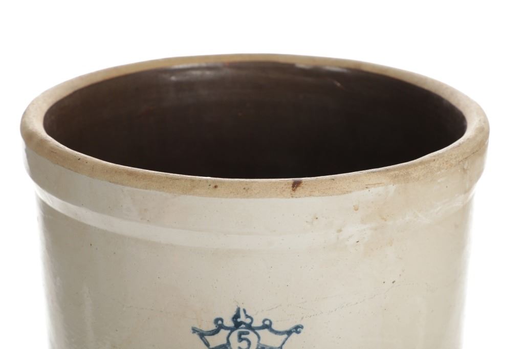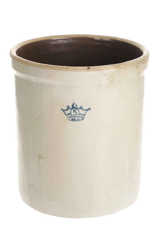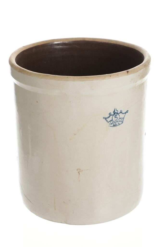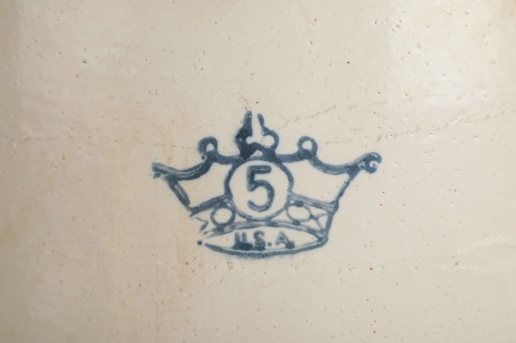 This is an original early Robinson Ransbottom 5 gallon stoneware crock. The crock features a wonderfully and professionally crafted stoneware construction with a crown and a 5 in the middle of the crown for the Robinson Ransbottom hallmark and denoting the size of the crock. In circa 1900, Frank Ransbottom and his brother started a pottery company in Roseville, Ohio to make stoneware and pottery and by 1916 Ransbottom Pottery was the largest producer of stoneware jars in America. Around 1920, they merged with Robinson Clay Products Co. who created bricks and titles with the name being changed to RRP Company. The condition of this of this stoneware crock is good with no obvious signs of damage and in good overall condition. The measurements of this crock are 13 1/2" x 12" x 12".